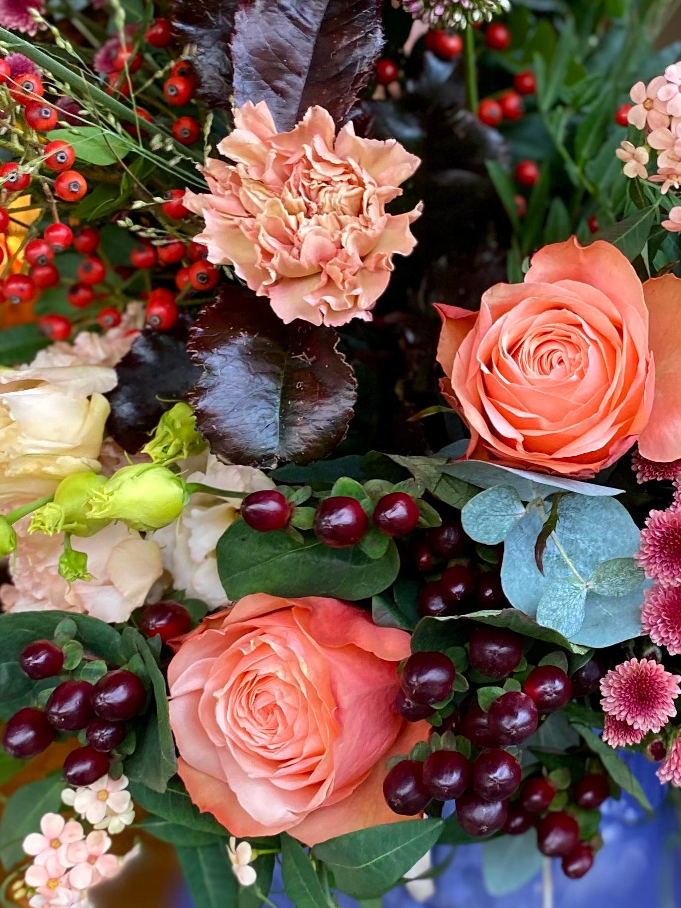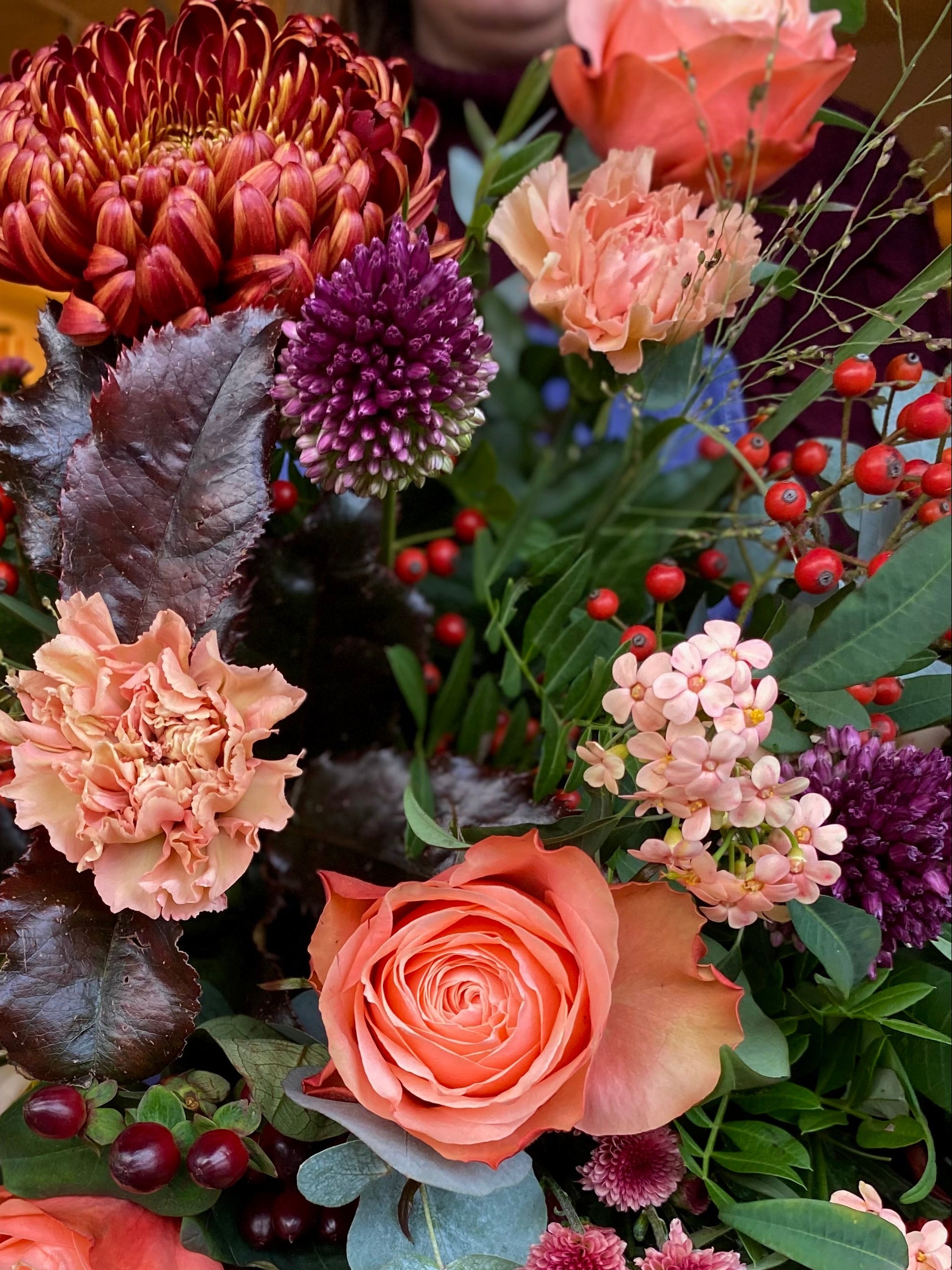 Expect autumnal Copper Vienna blooms, blousy Hermosa roses, and frilly Daucus, all woven together with leggy Snapdragons, flouncy lisianthus, hypericum berries, and delicate nerines. Threaded through are astrantia and oak leaf foliage, giving the bouquet its natural rhythm and warmth. We’ve added seed heads for that irresistible, tactile texture that makes you want to lean in and look closer.