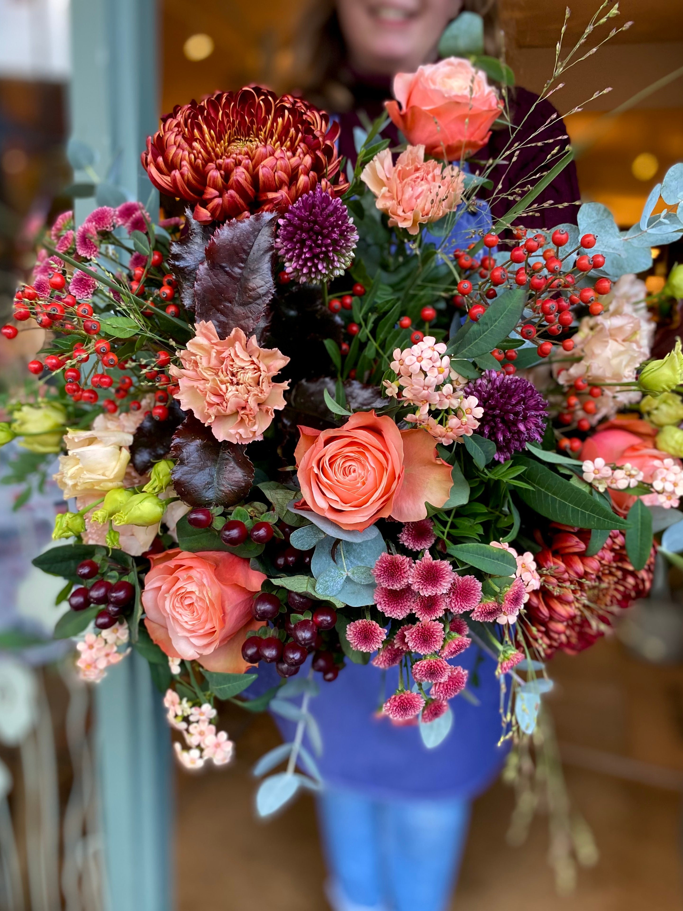 Artfully spiralled and full of depth, this bouquet is a feast for the senses — wild, natural, and effortlessly elegant. Perfect as a kitchen island centrepiece, a hallway showstopper, or simply as a thoughtful florist’s choice bouquet that whispers: autumn is in the air. 🍂