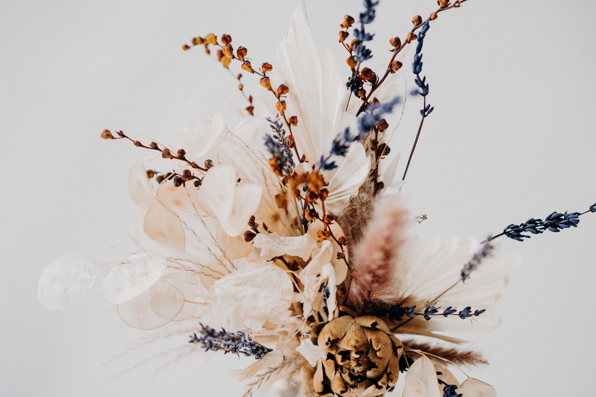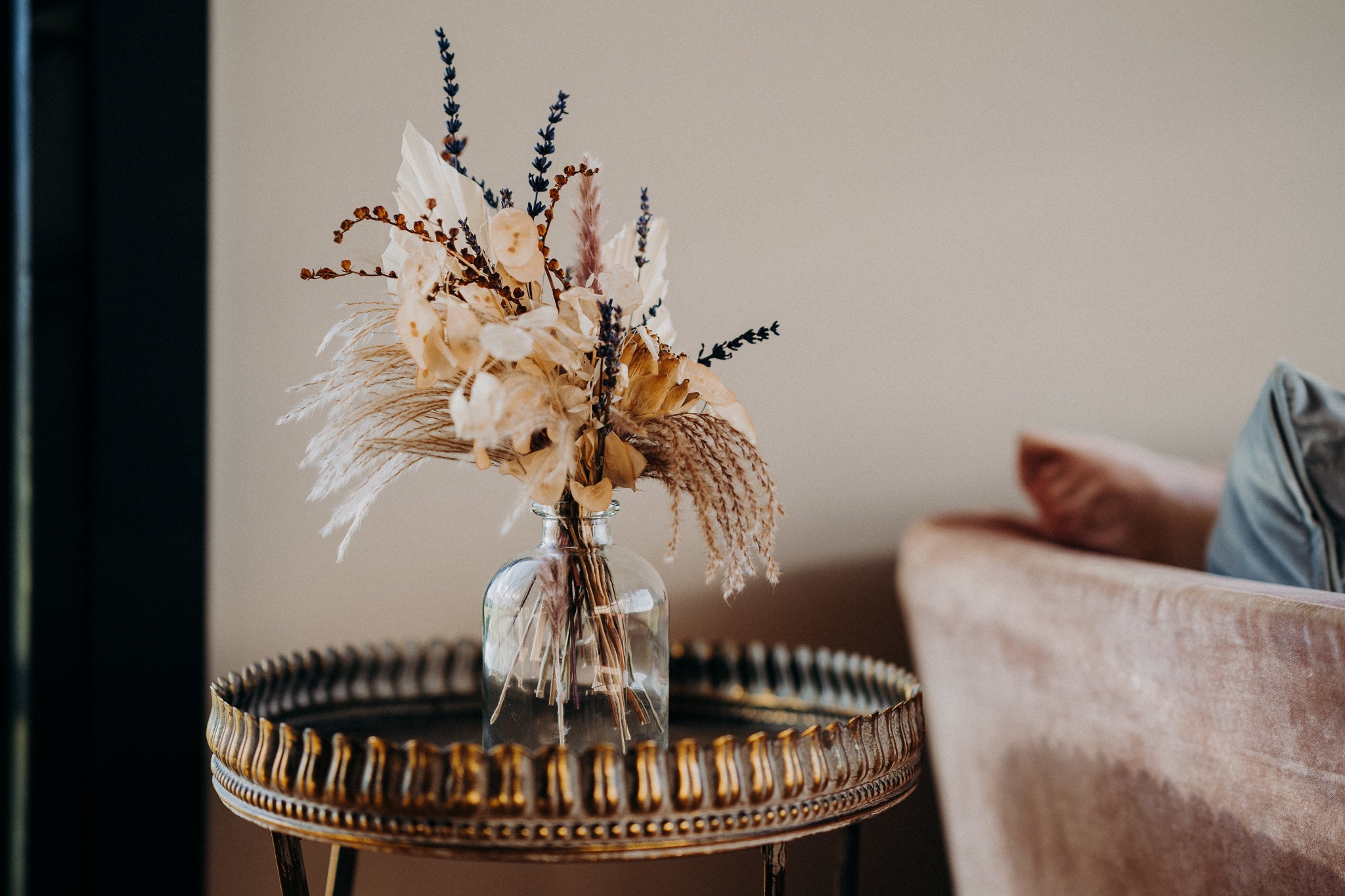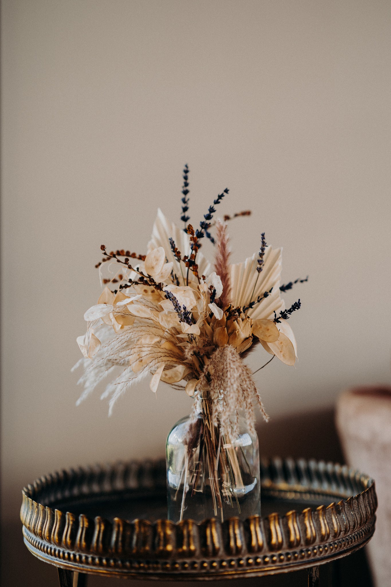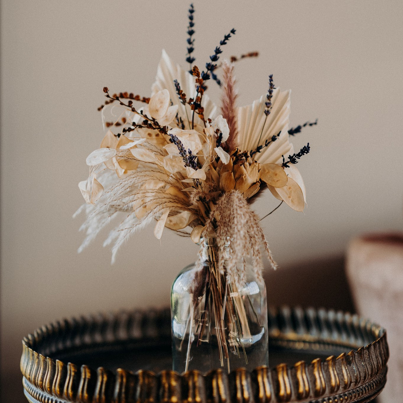A natural and stylish design of neutral dried flowers in a thick glass bottle. The collection includes, bleached ruscus, stipha grass, bunny tails, lavender complemented with other beautiful textured dried flowers and foliage.