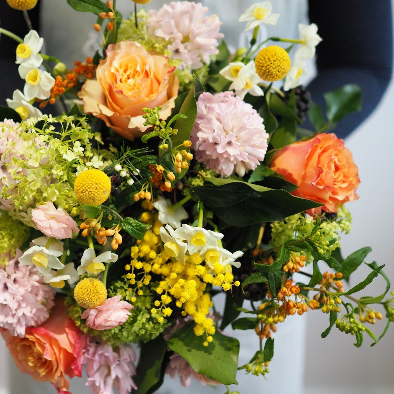 Savour the essence of spring with our enchanting 'Savil Gardens' bouquet. Delicate hues of Pink Hyacinths, Narcissus, Viburnum, Carpe Diem Roses and Craspedia are intertwined with seasonal foliage to bring you this exquisite bouquet.