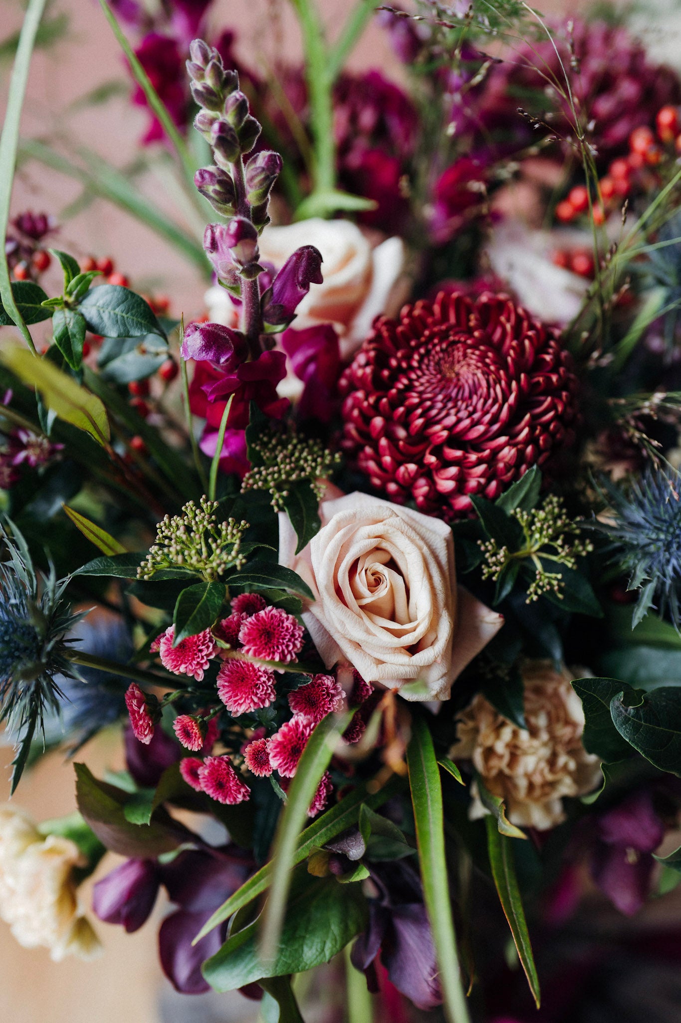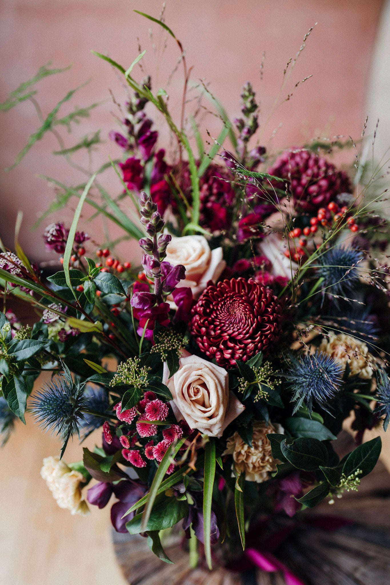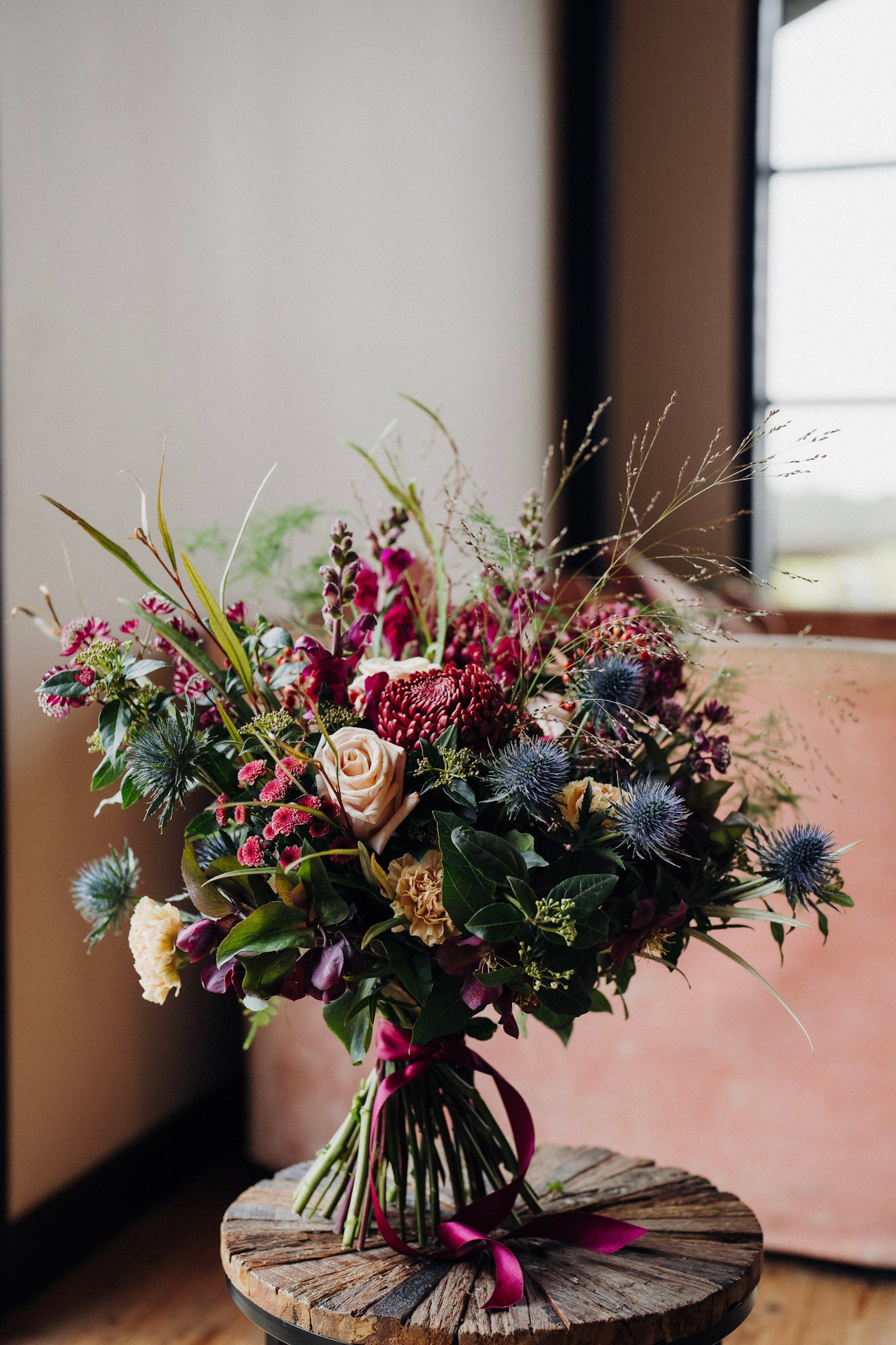 Expect spiky blue Eryngium, dusky Marsala blooms, and ruffled Mother of Pearl Roses, nestled alongside Cherry Tyolo Santini, caramel Dianthus, and plum Snapdragons. Threaded through are wisps of seasonal winter foliage and grasses, adding texture, movement, and that hint of wildness we love.