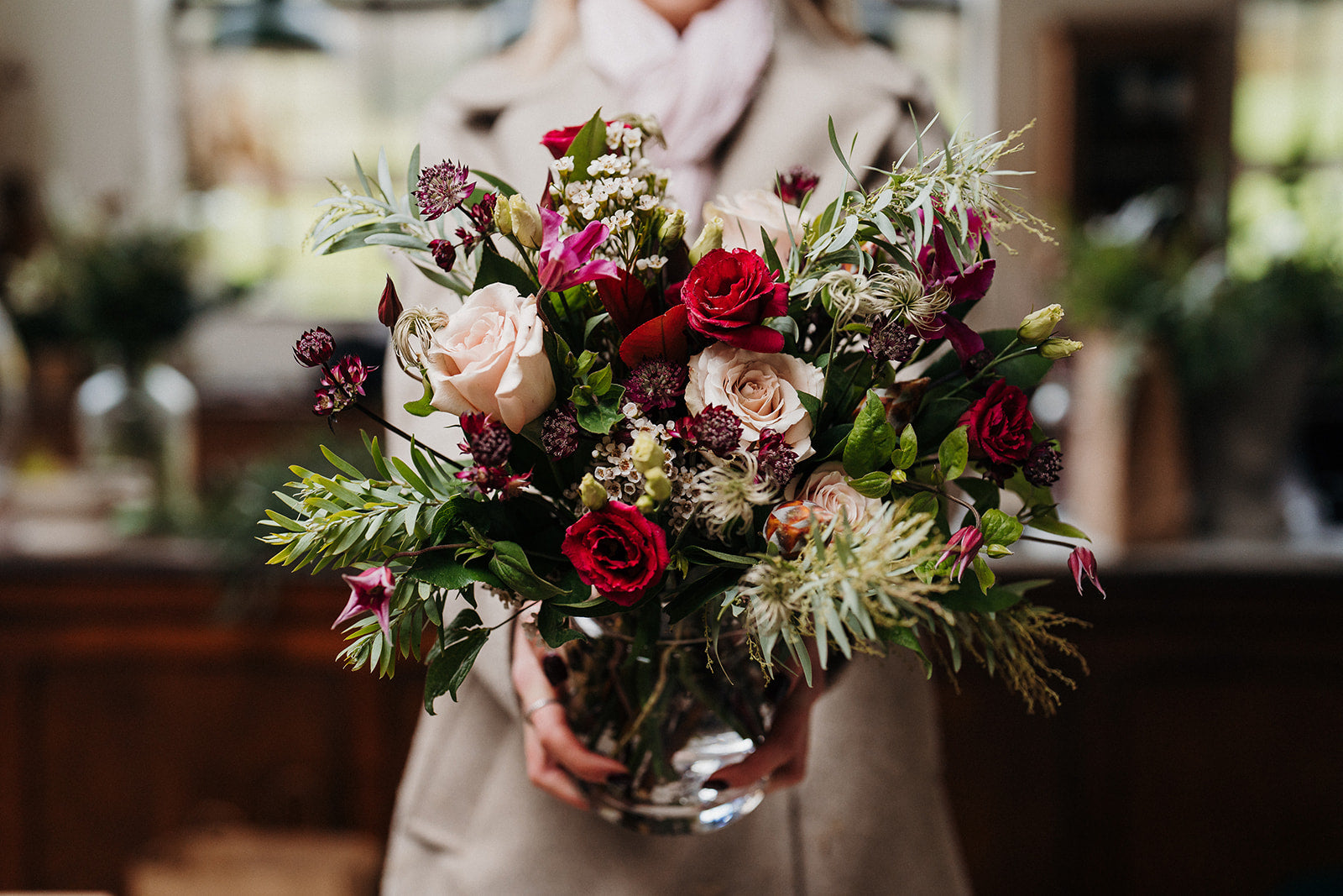 Expect luxurious Quicksand roses alongside deep red lisianthus, delicate waxflower, astrantia, and clematis, all woven through with ligustrum berries, mimosa, and eucalyptus foliage. Cones and textured greenery add a touch of woodland charm, while the overall palette shimmers with that city-at-Christmas allure — romantic, glowing, and full of heart.