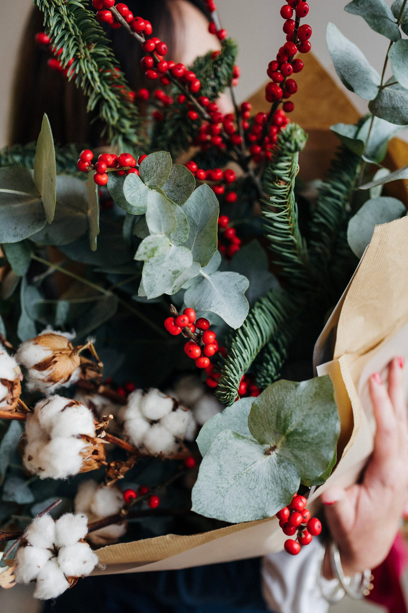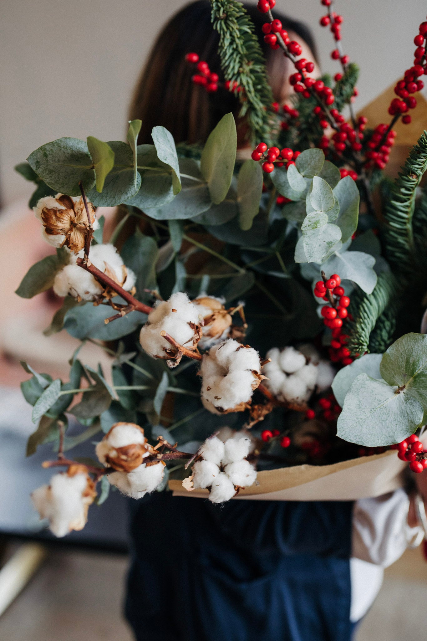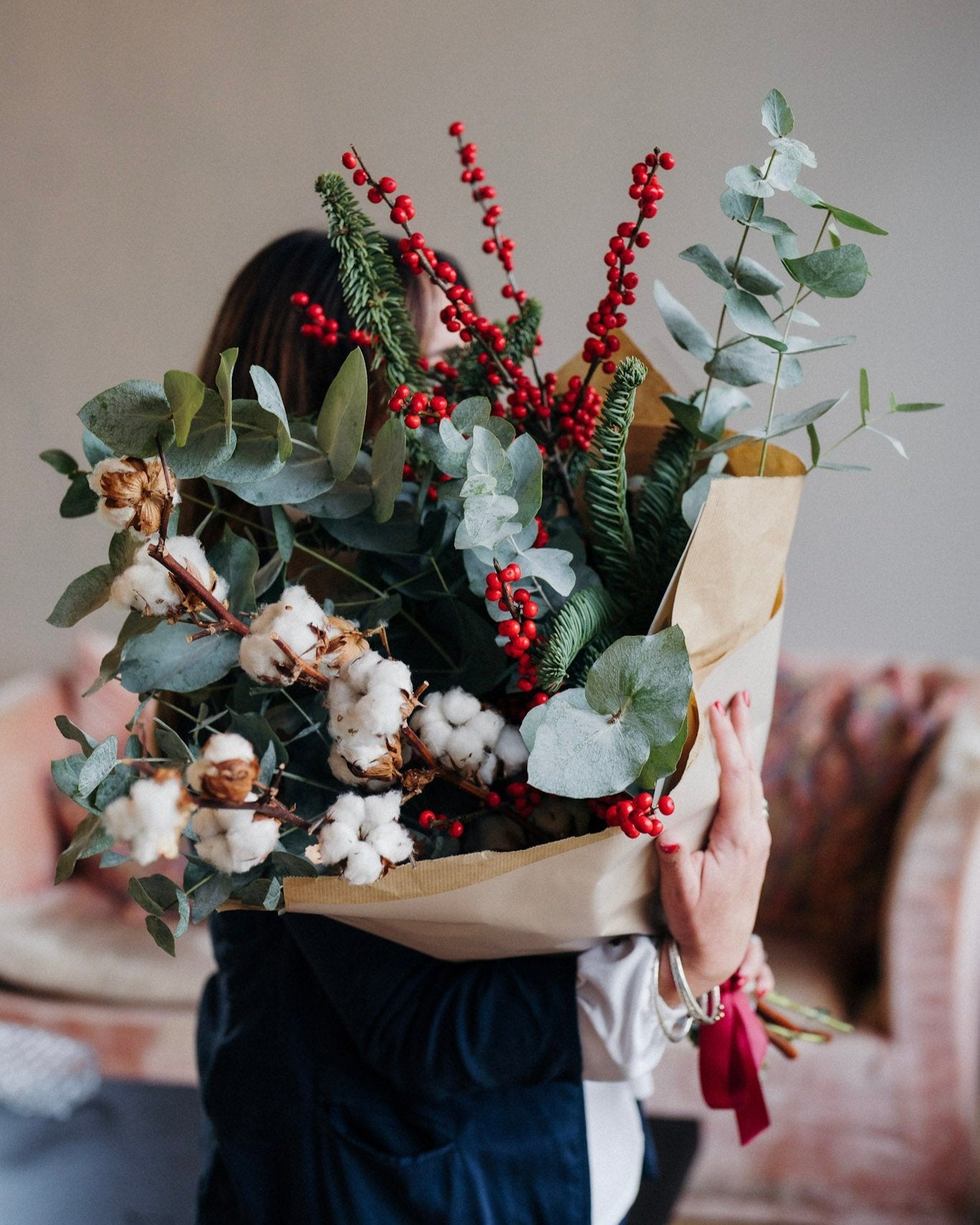 Our florists will handpick a beautiful selection of fresh festive stems — fragrant Eucalyptus, glossy Ilex berries, textured pine, and soft cotton — gathered from our daily flower deliveries and brimming with seasonal charm.