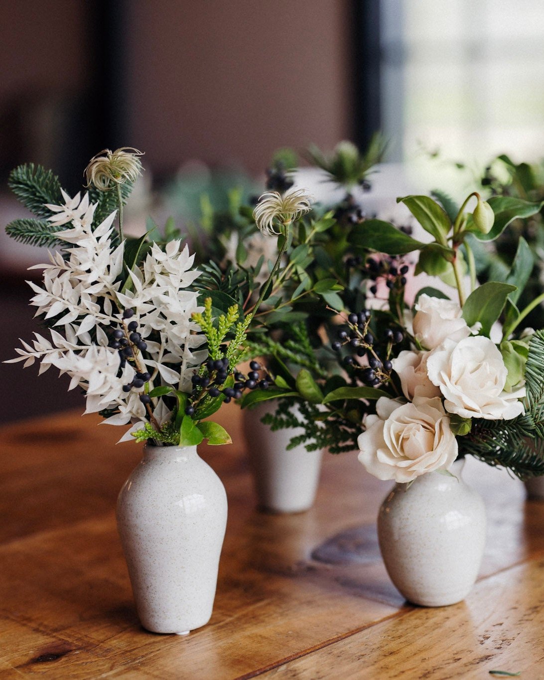 Each delicate vase is filled with a selection of white flowers and festive foliage, artfully arranged to capture the soft, pristine look of freshly fallen snow. Elegant, understated, and effortlessly stylish, this design embodies the quiet calm of Nordic simplicity.