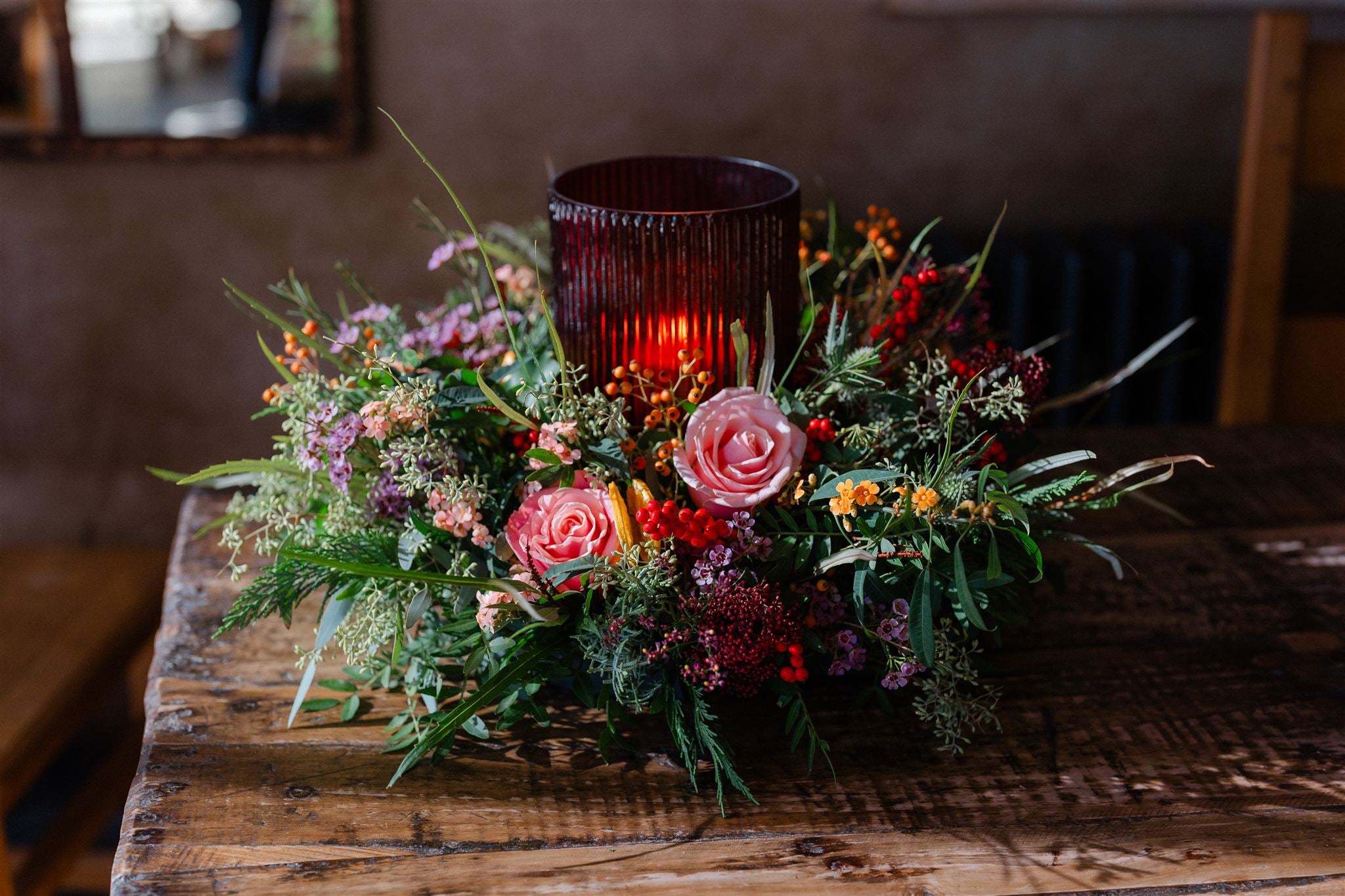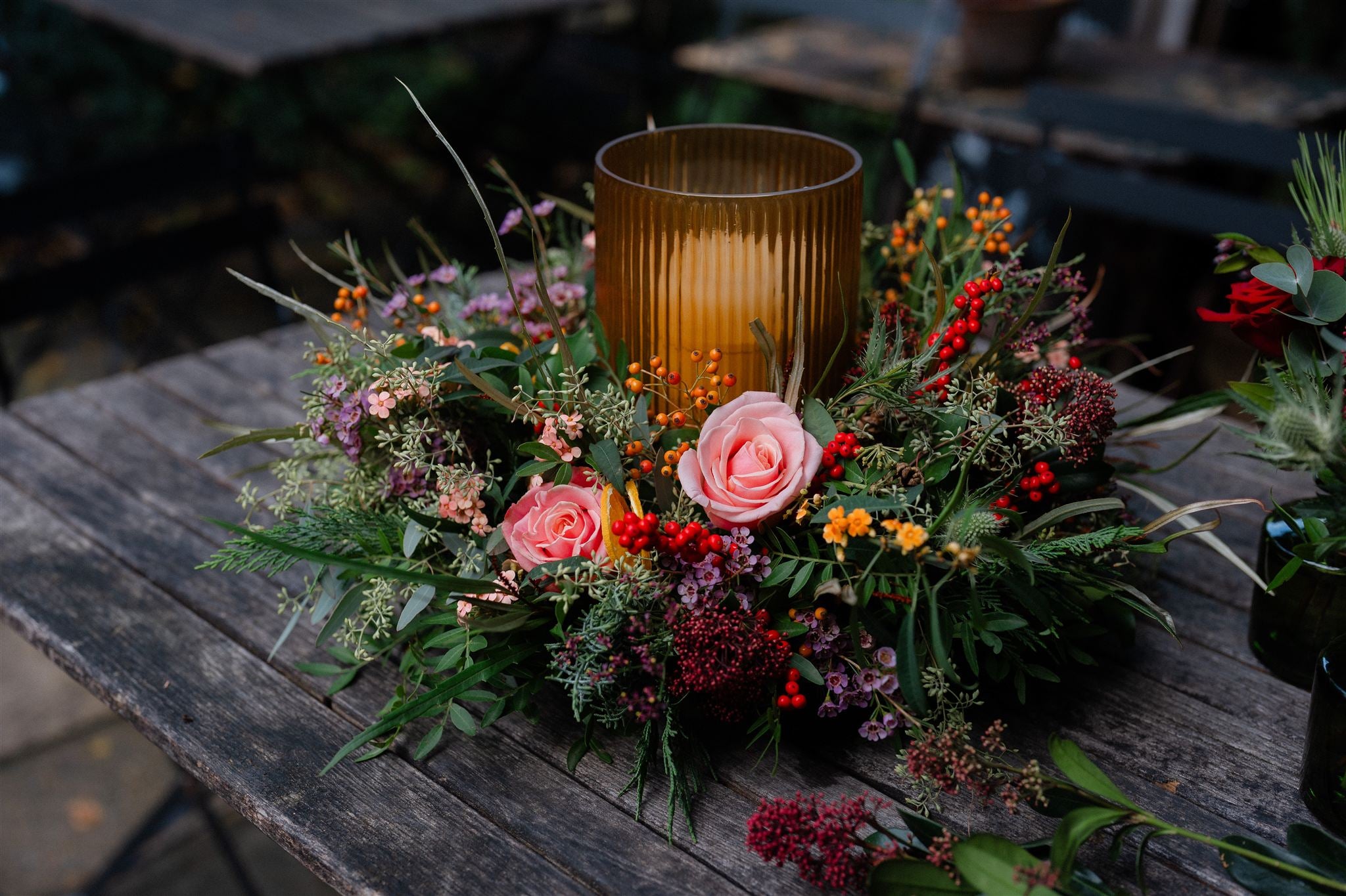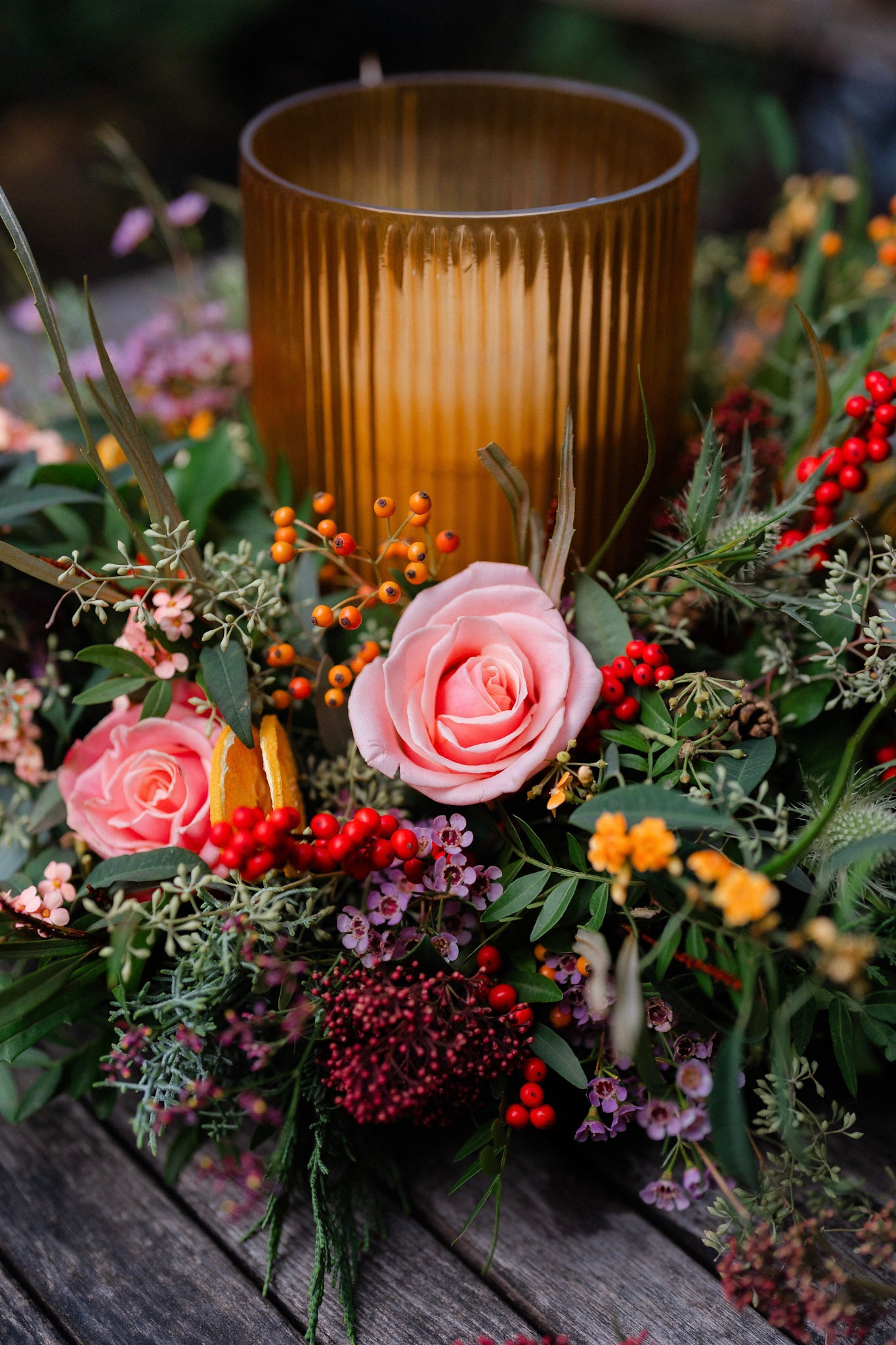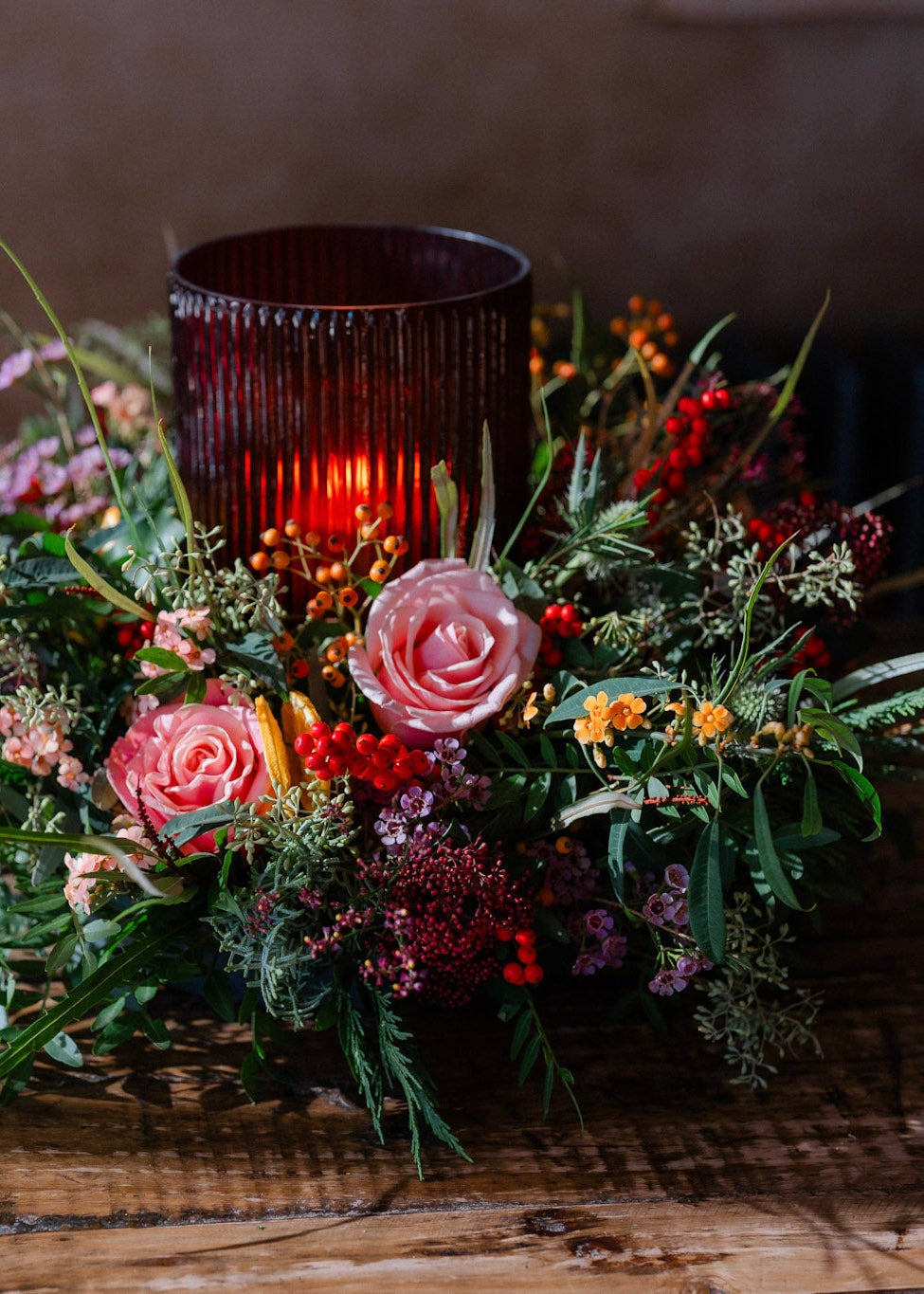 A ribbed glass hurricane lamp and softly glowing pillar candle complete the look, casting a romantic light across your Christmas table. Perfect for adding a touch of floral luxury to your festive décor.
