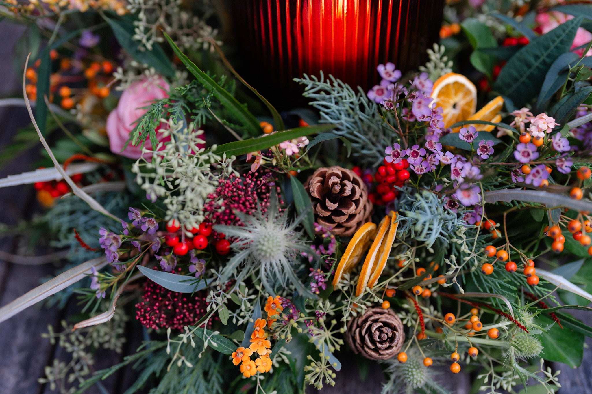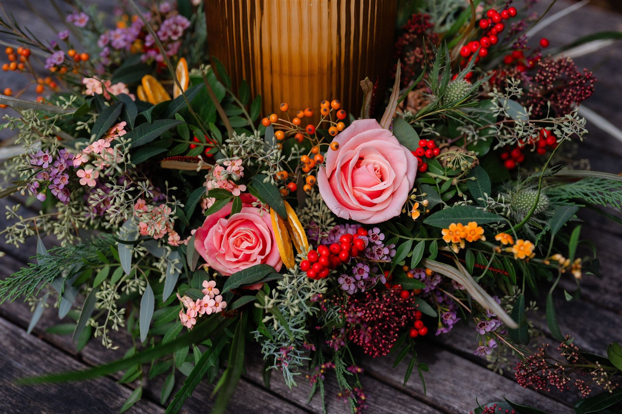 Featuring pretty dusky pink roses, berries, skimmia, waxflower and scented festive foliage, each arrangement is artfully layered to create a rich, natural composition full of seasonal colour and charm.