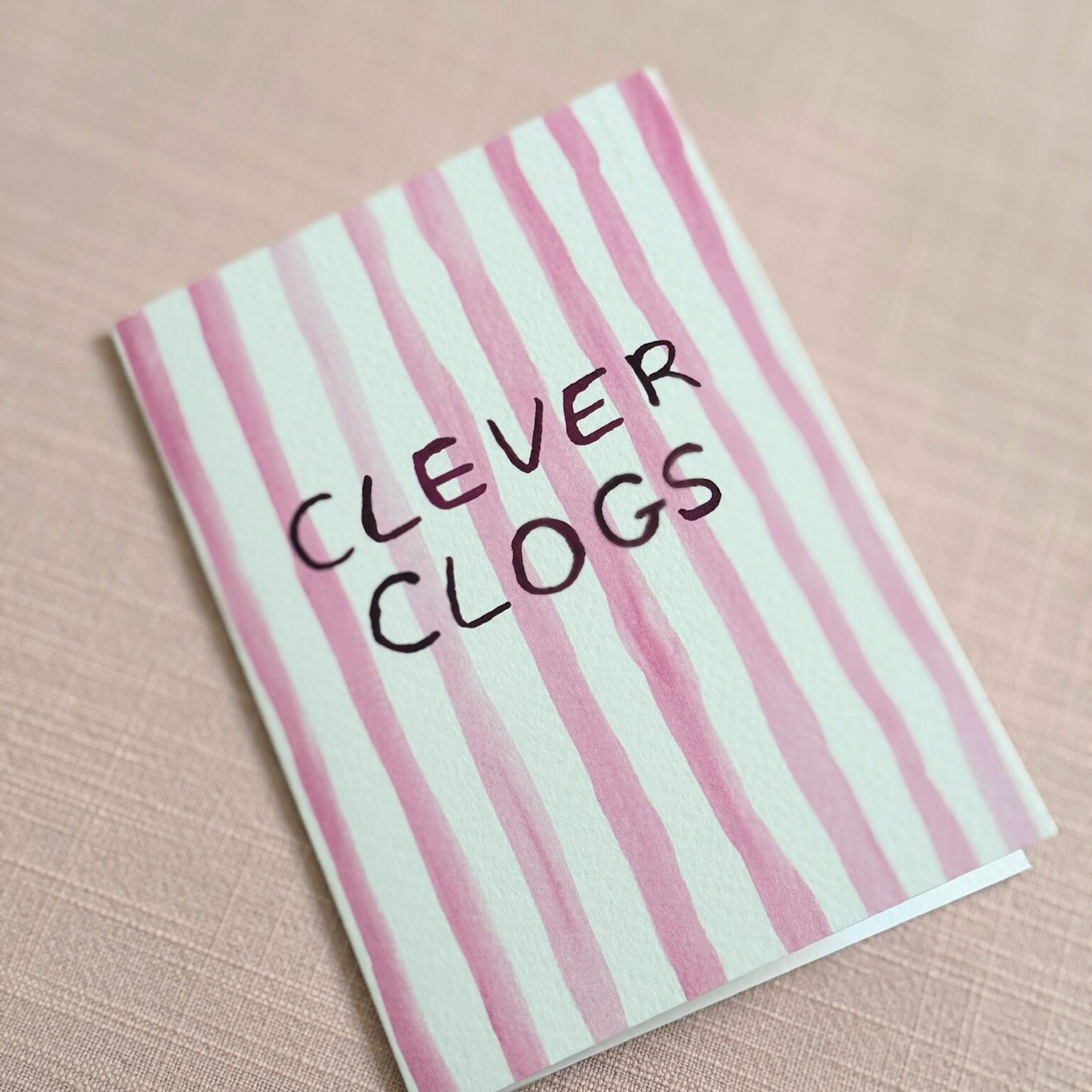 Our Clever Clogs Card is a playful, design-led way to celebrate life’s big (and brilliantly well-earned) moments. Featuring soft pink watercolour stripes paired with bold maroon lettering, this modern congratulations card strikes the perfect balance between fun and stylish.