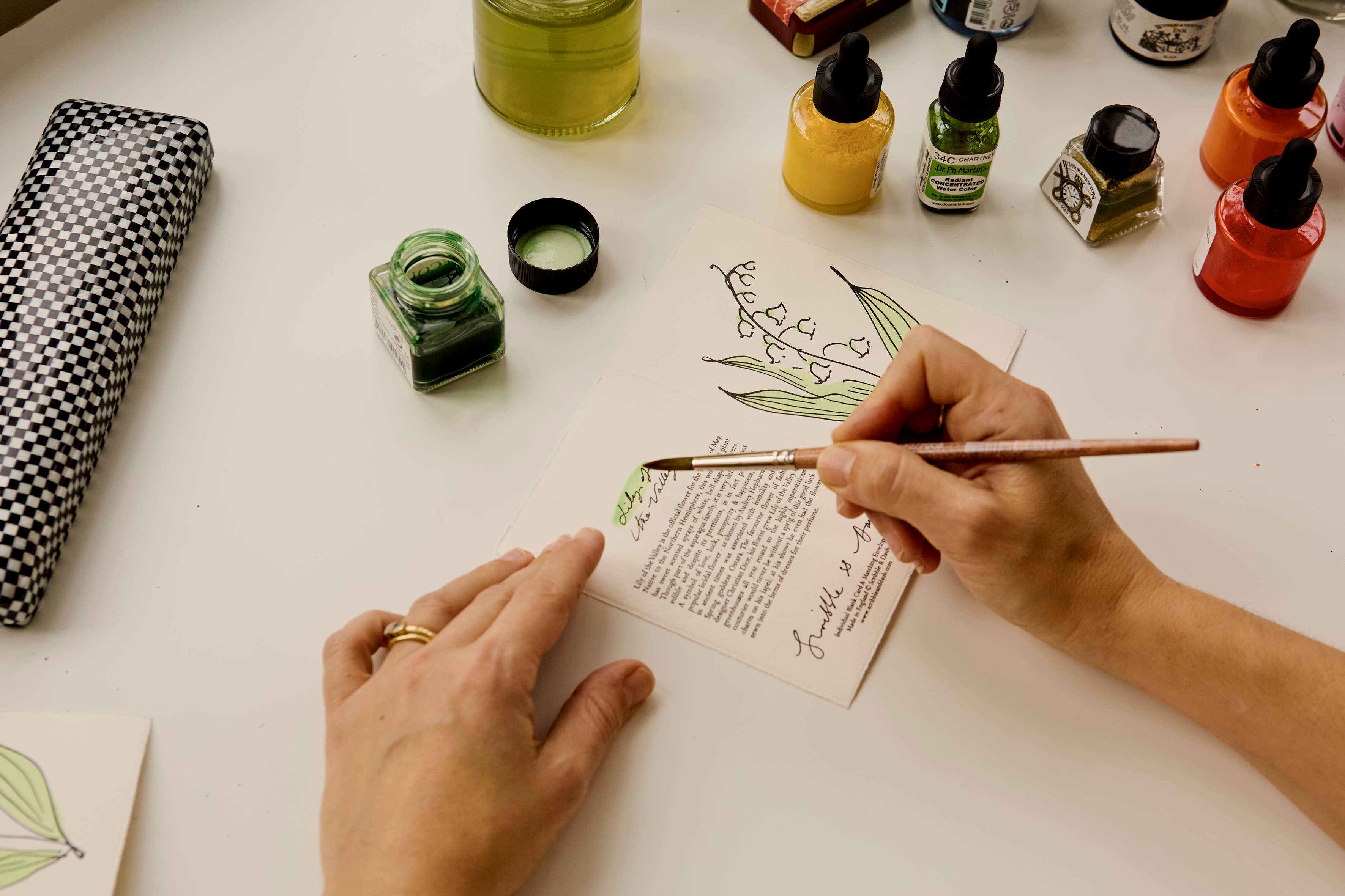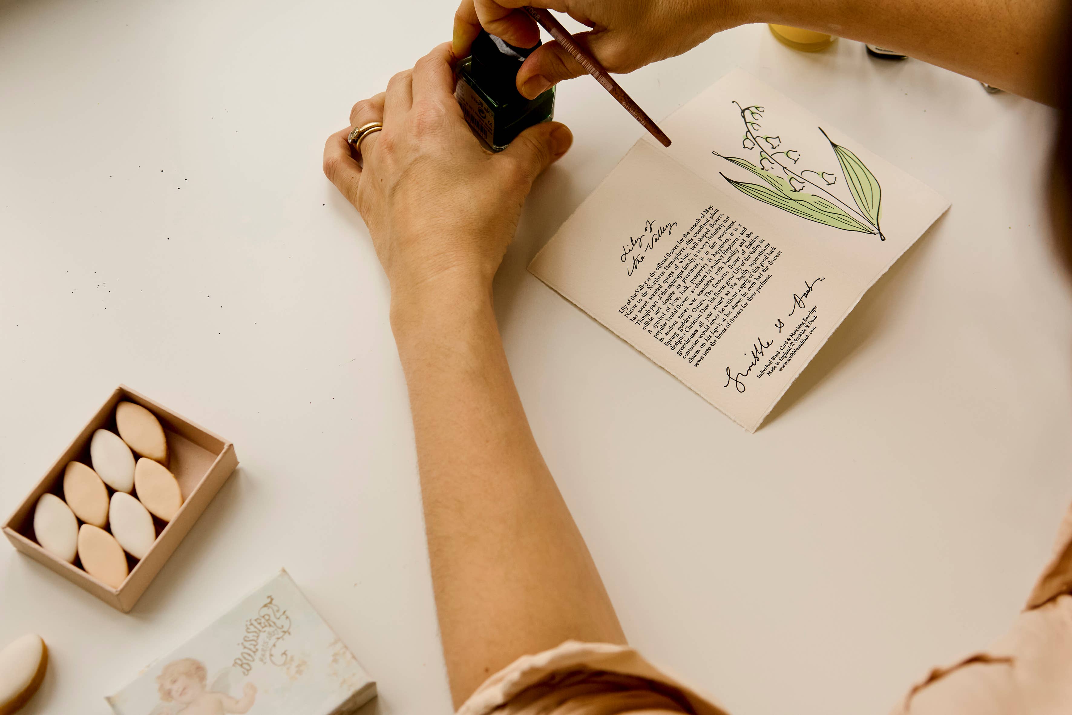 Featuring a graceful hand-drawn botanical illustration, the front is adorned with a floriferous scribble, while the reverse shares the symbolism of Lily of the Valley—traditionally associated with sweetness, humility, and happiness.