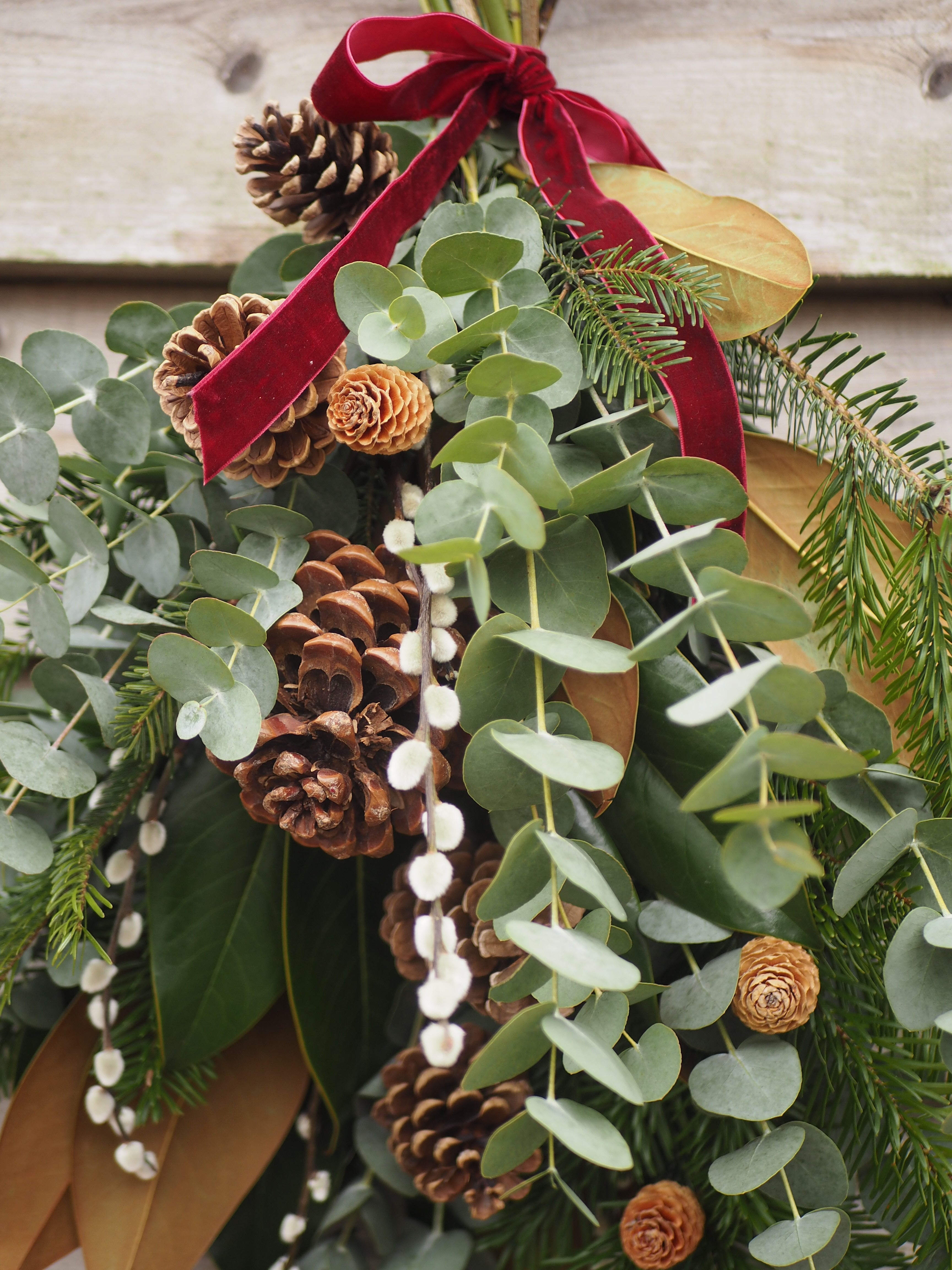 Bring a touch of winter woodland magic to your home with our Frosted Pines Luxury Christmas Door Swag. Handcrafted with blue spruce, magnolia, eucalyptus foliage, pussy willow, and natural pinecones, this elegant design is finished with a soft velvet ribbon for a timeless festive look.