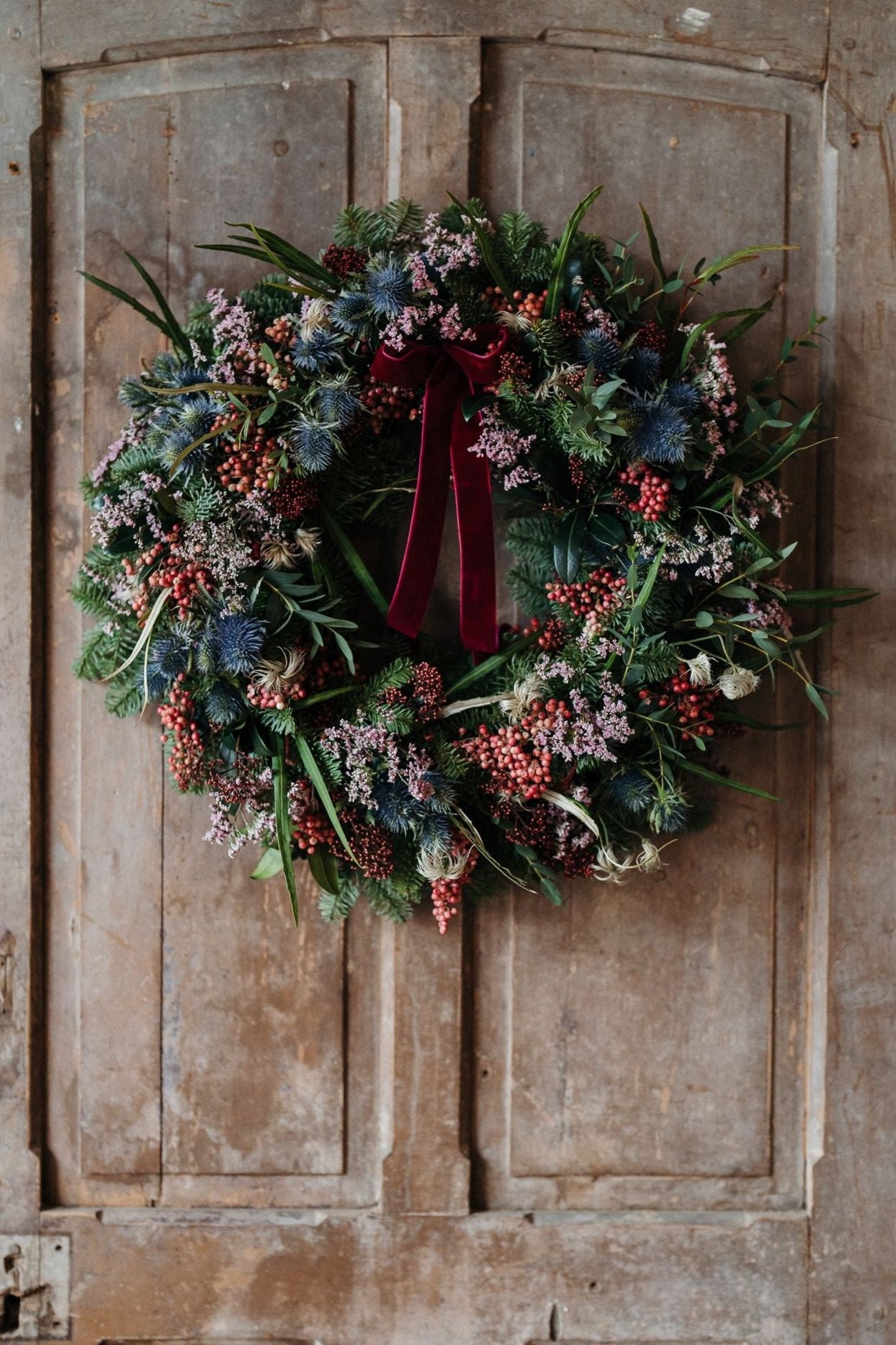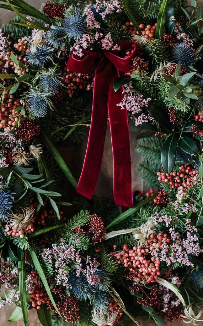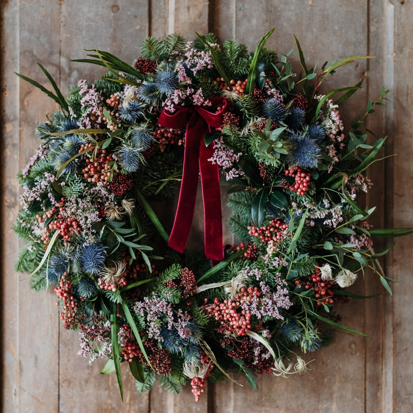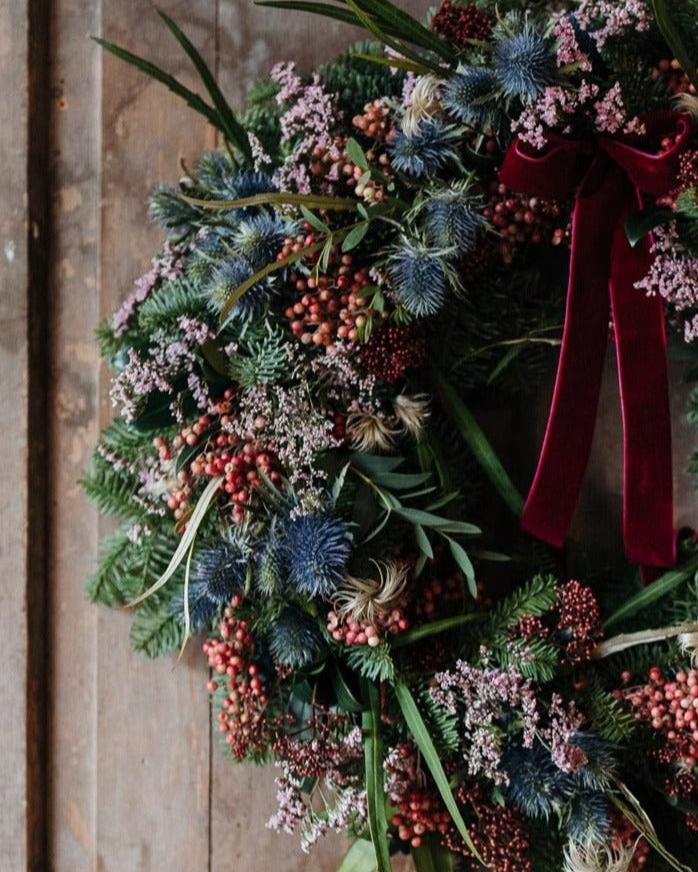 Handcrafted by our florists, this elegant wreath blends Blue Spruce Pine, Skimmia, Blue Sea Holly, Pink Pepperberry, Lilac Limonium, and Clematis Seed Heads for a soft, romantic palette of winter colour and texture.