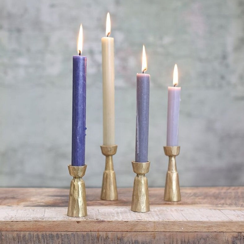 Add timeless elegance to your home with these Nkuku Jahi Brushed Gold Brass Candlesticks. Expertly hand-forged from solid brass, each piece features a beautifully brushed finish that catches the light and brings a touch of rustic luxury to your dining table, mantelpiece, or shelf display.