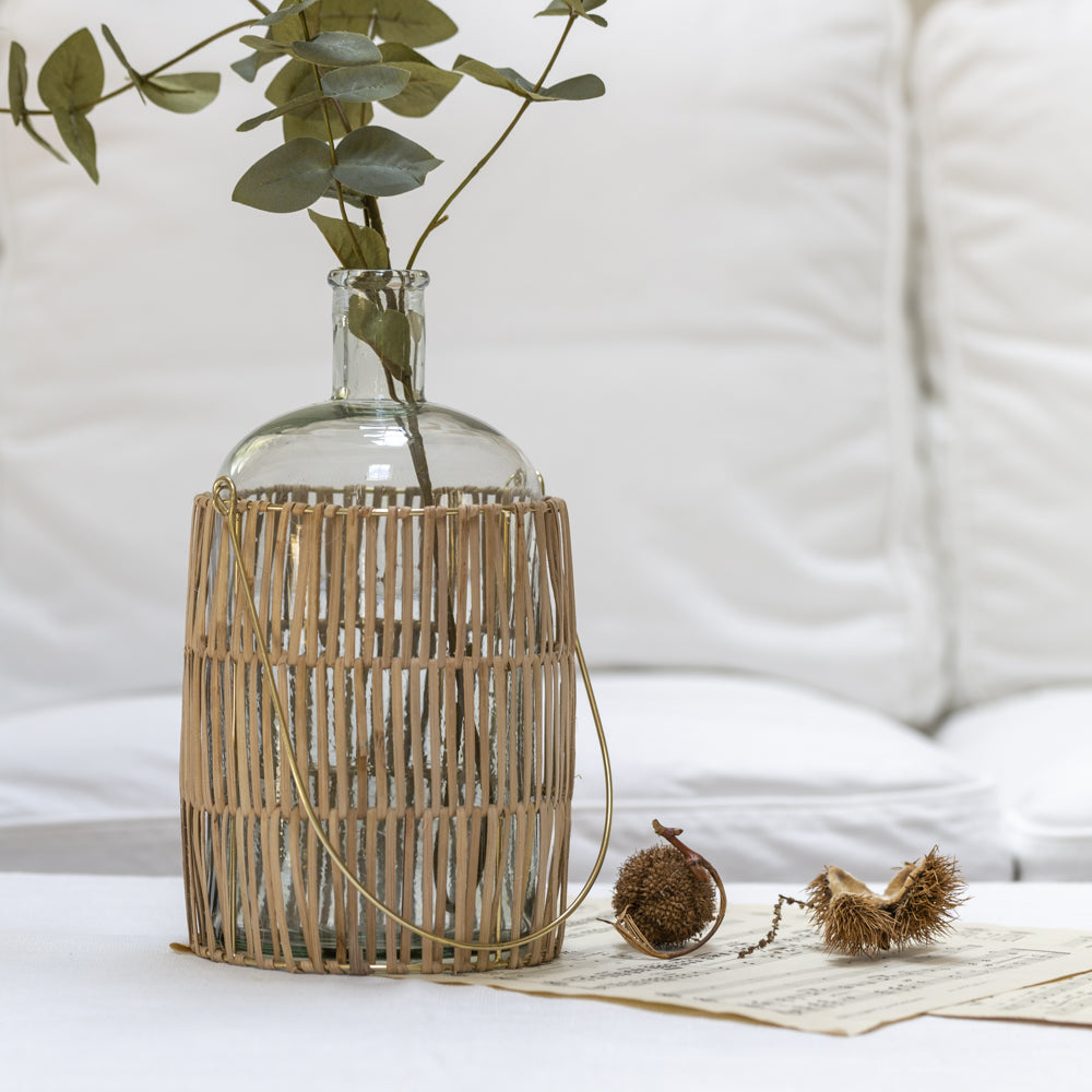 Bring an essence of bohemian style into your interior with this charming handcrafted glass bottle with cane sleeve and practical handle.