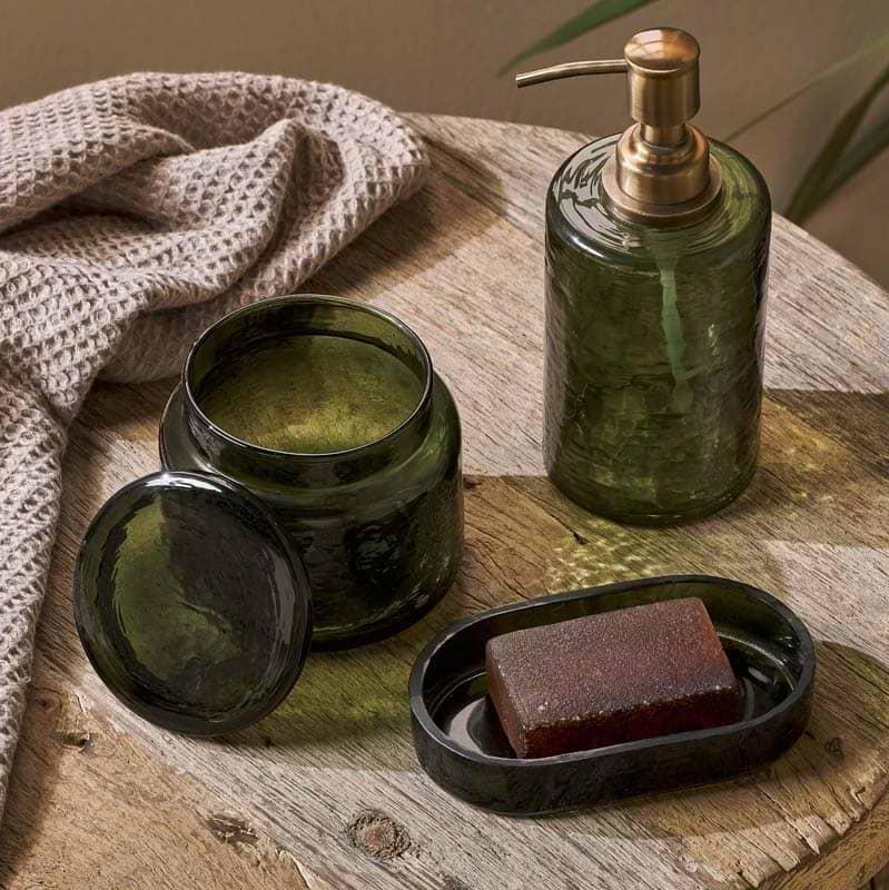 Made from recycled glass, each piece features a beautifully tactile hammered finish that enhances the rich green tones and gives it an organic, artisanal feel. The matching glass lid sits neatly on top — ideal for storing cotton pads, bath salts, or small bathroom essentials.
