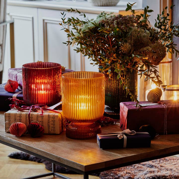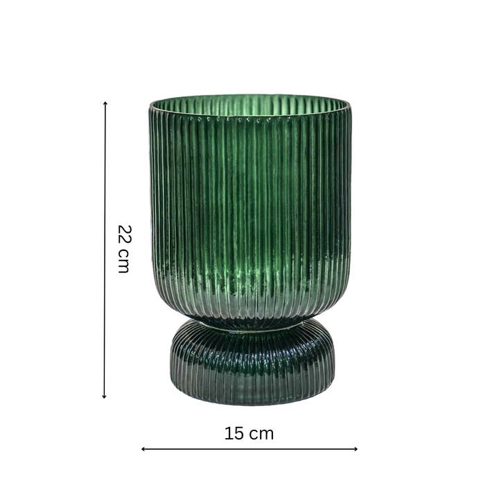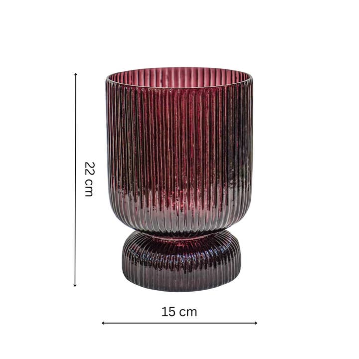 The ribbed design work makes this a unique design and is available in a jade, amber and ruby glass finish that is perfect for tables, consoles, buffet tables or mantels.