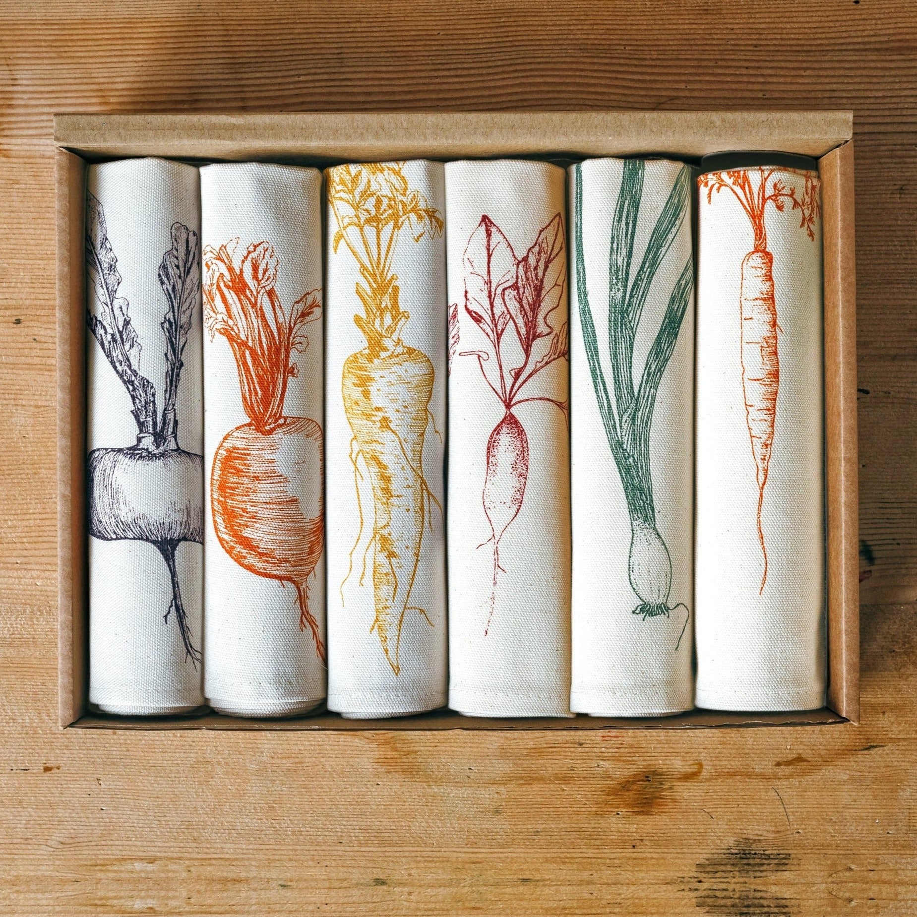 Featuring original illustrations of purple turnips, orange swede, creamy parsnips, spring onions, carrots and radishes these handmade accessories are inspired by the root vegetables from my fathers allotment in Norfolk and are the perfect gift for a chef or cooking enthusiast.
