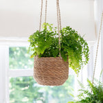 Elevate your indoor greenery with our Hanging Plant Pots, crafted in natural Jute and Seagrass for a warm, botanical feel. Available in three shapes, each pot includes a practical PVC liner for easy planting and watering. Designed to hold up to 5kg, they feature sturdy jute ropes for effortless hanging in kitchens, orangeries, summerhouses and more. Perfect for ferns, herbs and trailing plants, these hand-woven pots bring a relaxed, wild touch to any interior. Dimensions: H16 x D16.5cm, full height 90cm, rope length 74cm. Crafted in Jute.