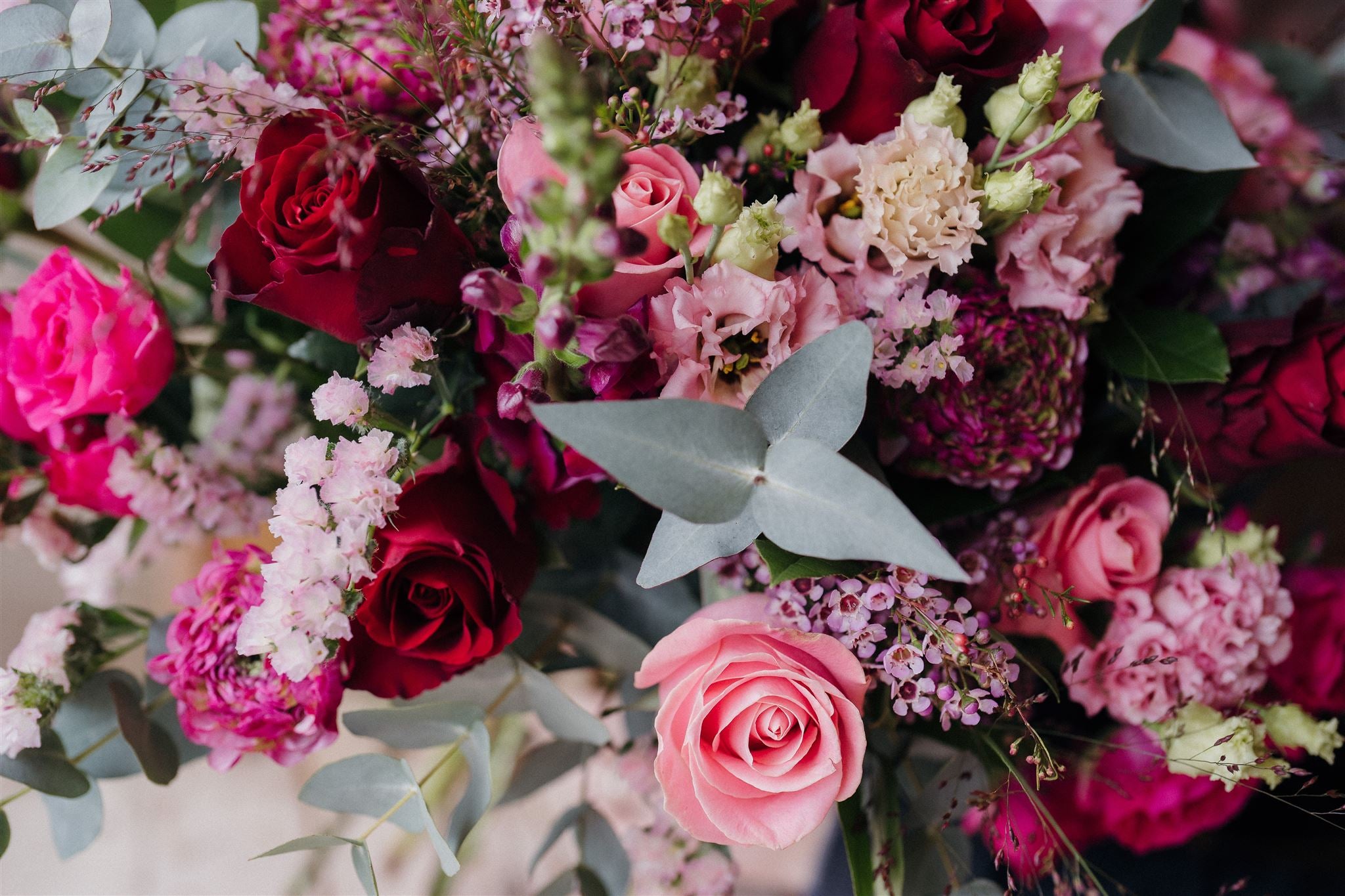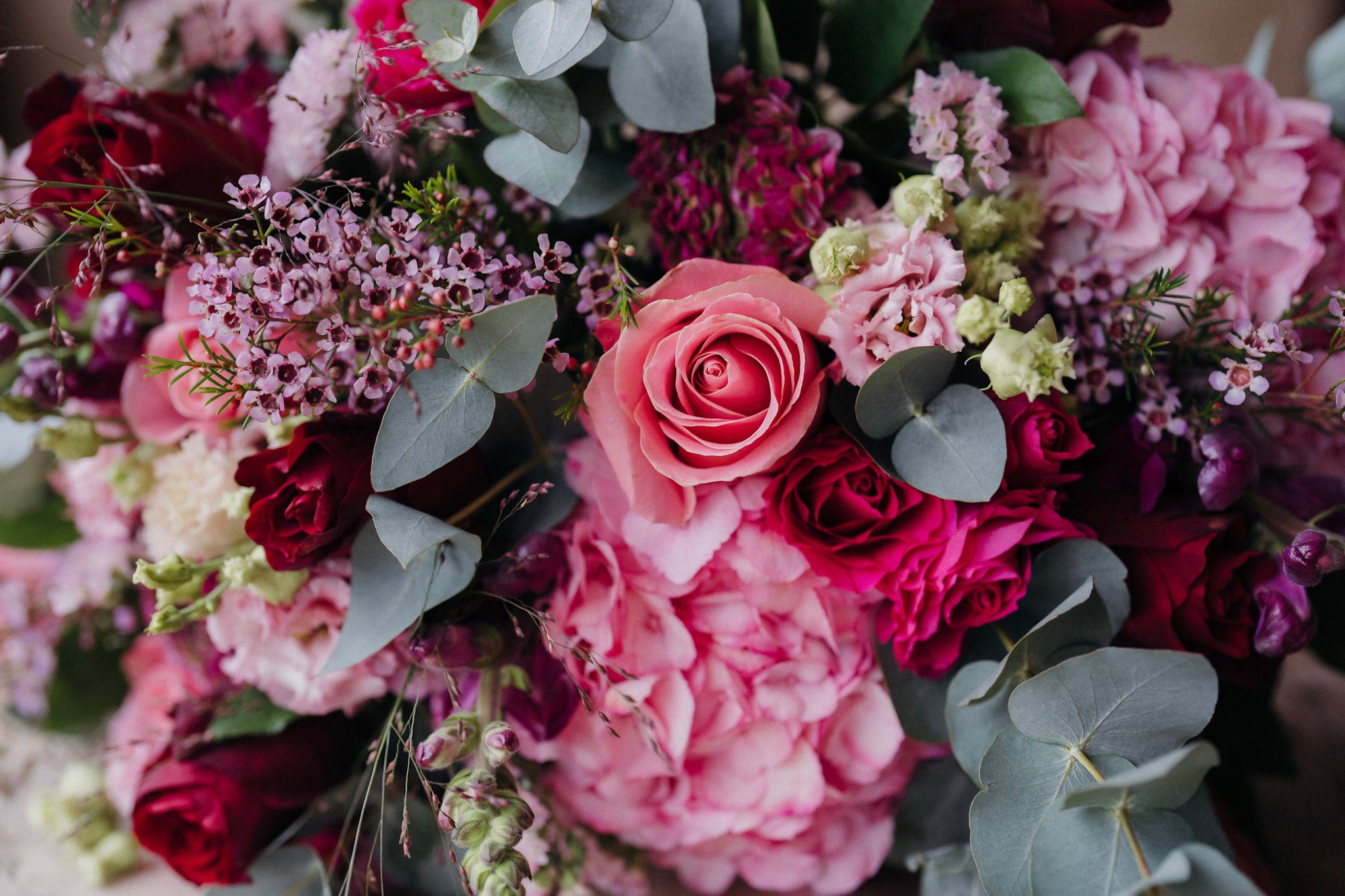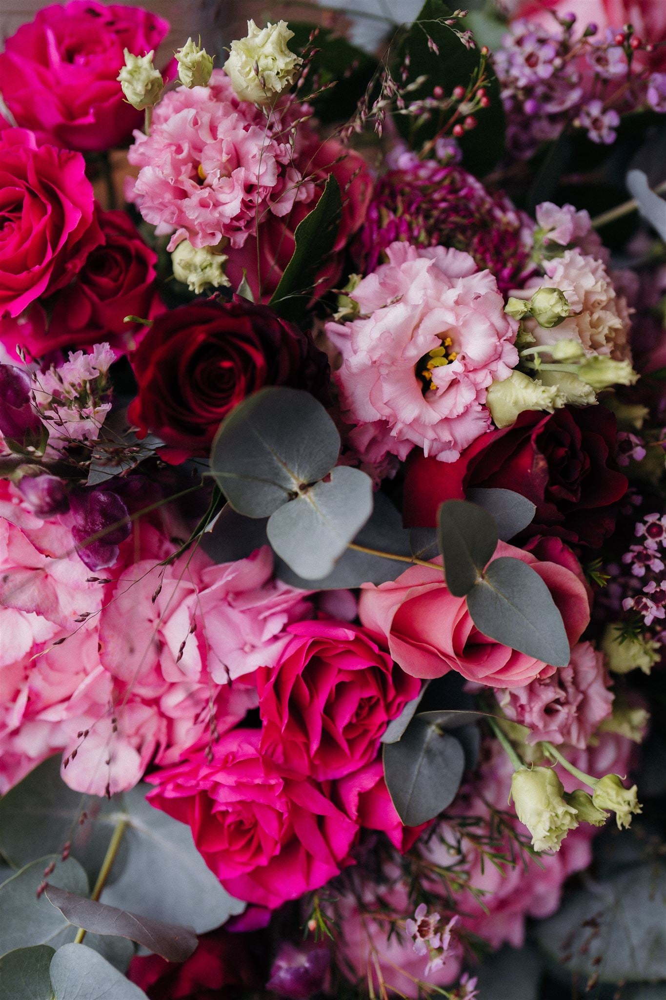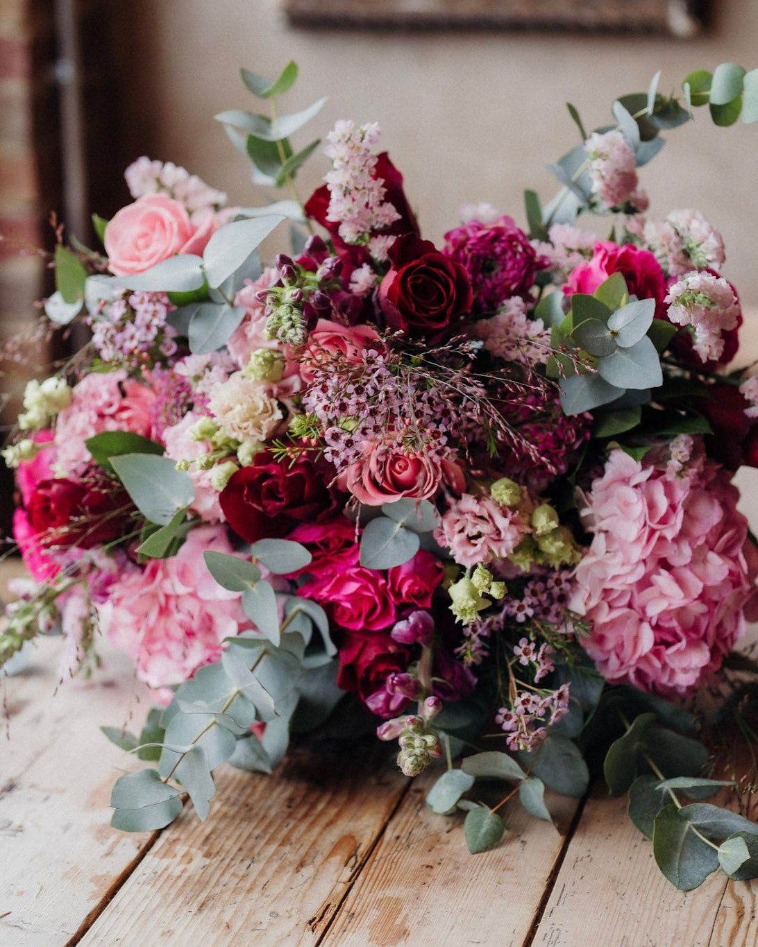 Our Head-Turner Bouquet is a bold, luxurious display designed to dazzle. With its marshmallow pinks and rich marsala reds, this hand-tied beauty mixes Hermosa roses, pink hydrangeas, snapdragons, lisianthus, waxflower, and fragrant eucalyptus for a bouquet that’s as striking as it is unforgettable.