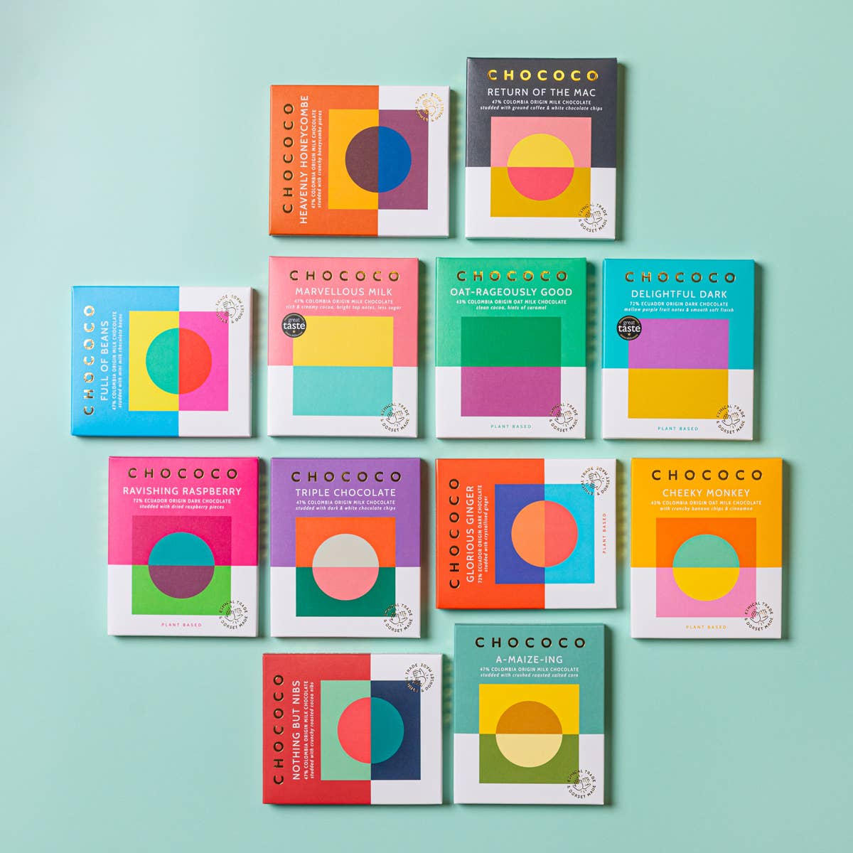One of Chococo's favourite flavour combinations, this handcrafted bar of their signature 47% single origin rich, creamy milk chocolate, made exclusively for them in Colombia, partners beautifully with the crunchy honeycomb pieces handmade at Chococo with local Dorset honey.