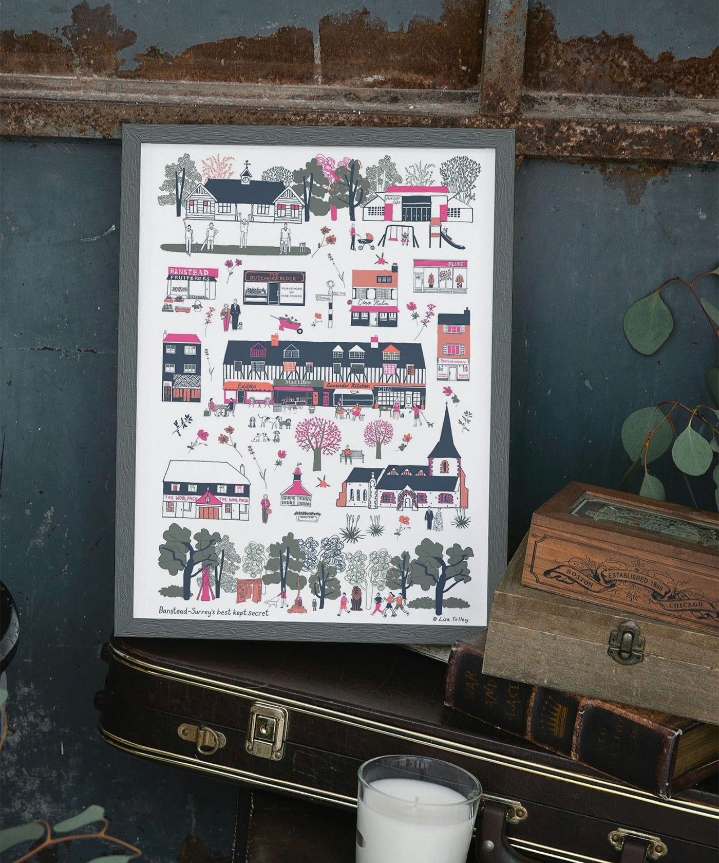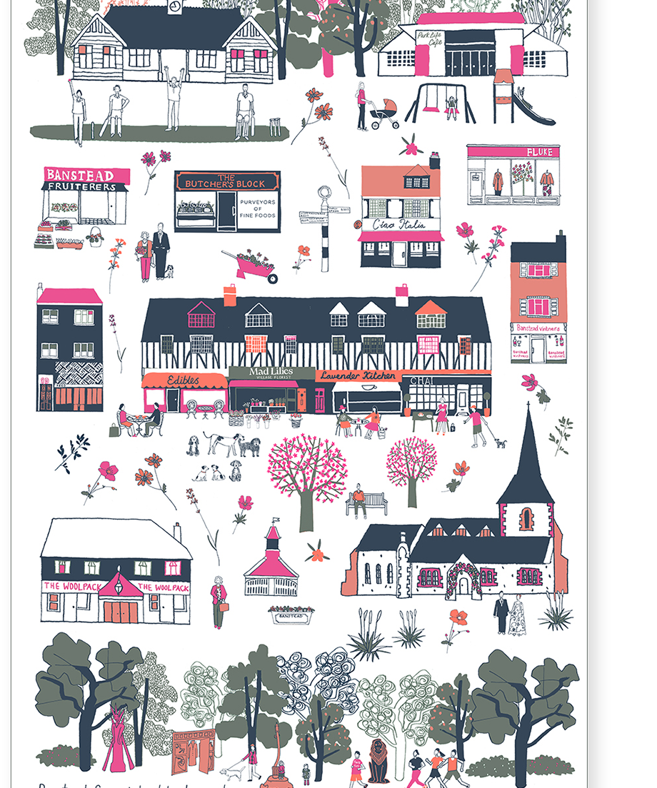 New for 2026, renowned Surrey illustrator Lisa Tolley has updated our popular Banstead Village Life portrait, celebrating the Banstead we know and adore: our new home at 127 High Street, our new cafe neighbours at our new address, the Saturday Running Club regulars and of course all our four-legged friends.