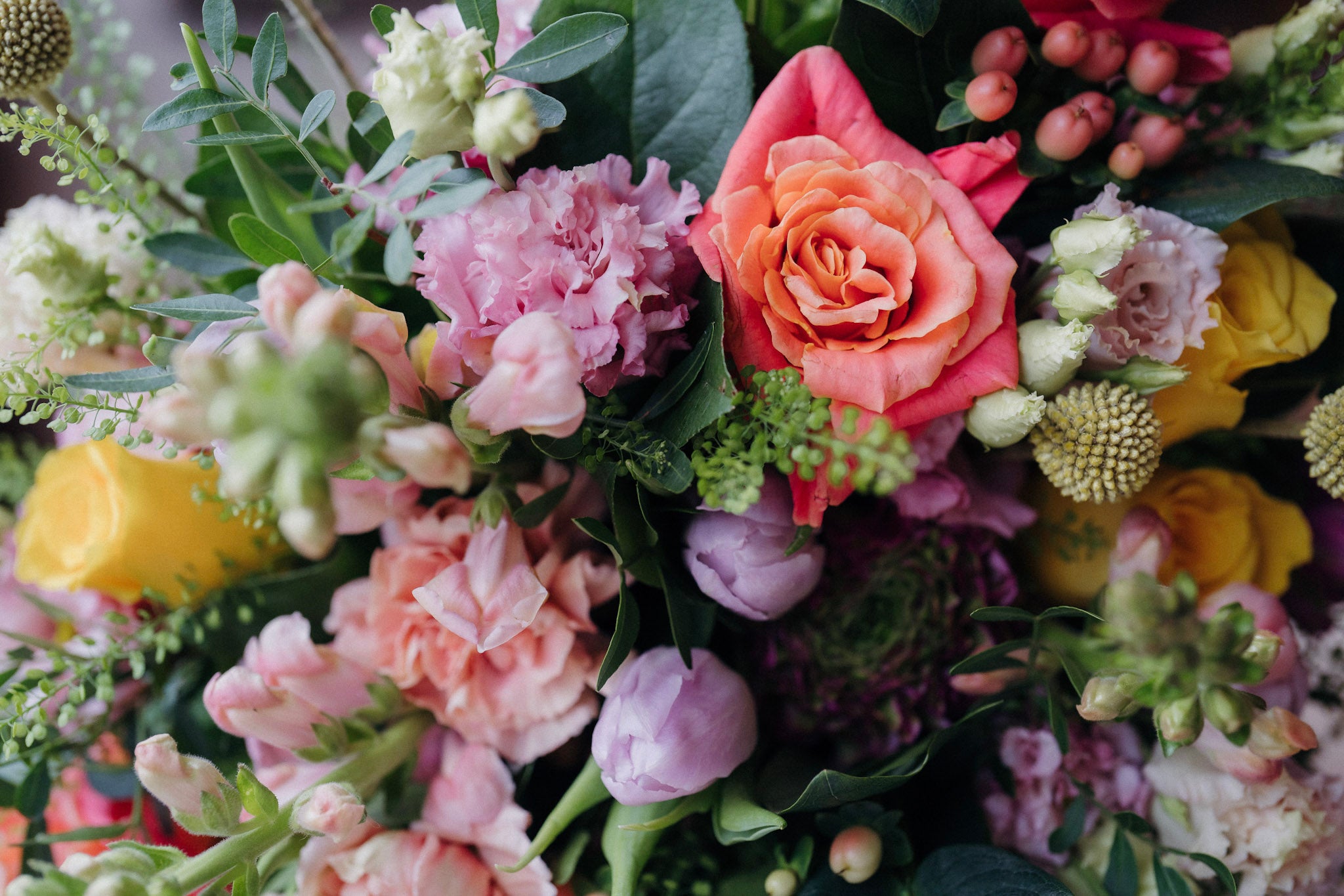 February’s Bouquet of the Month is hand-tied and effortlessly luxurious — a confident collision of corals, blush pinks, plum and fresh greens as winter begins to loosen its grip and spring tiptoes in.