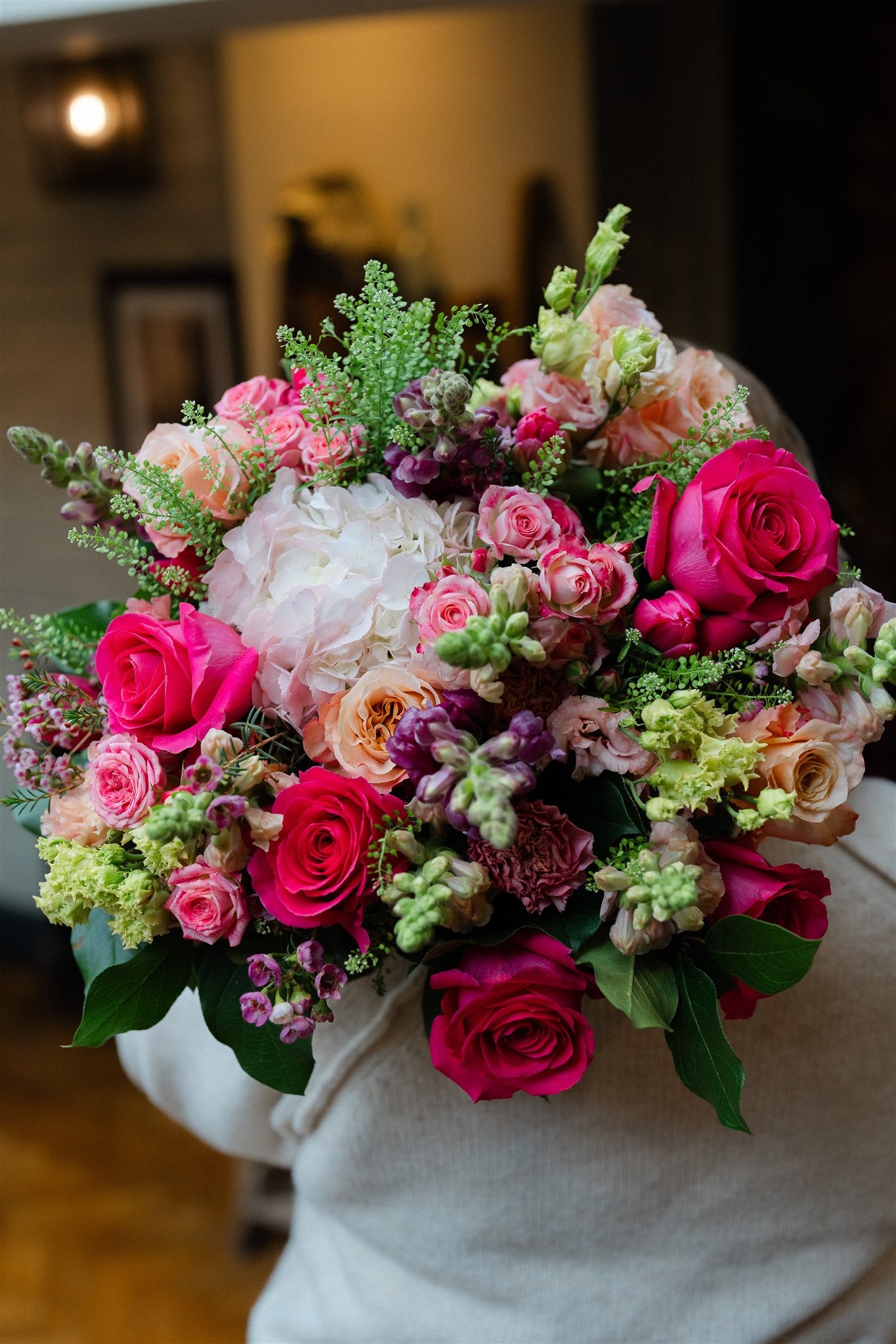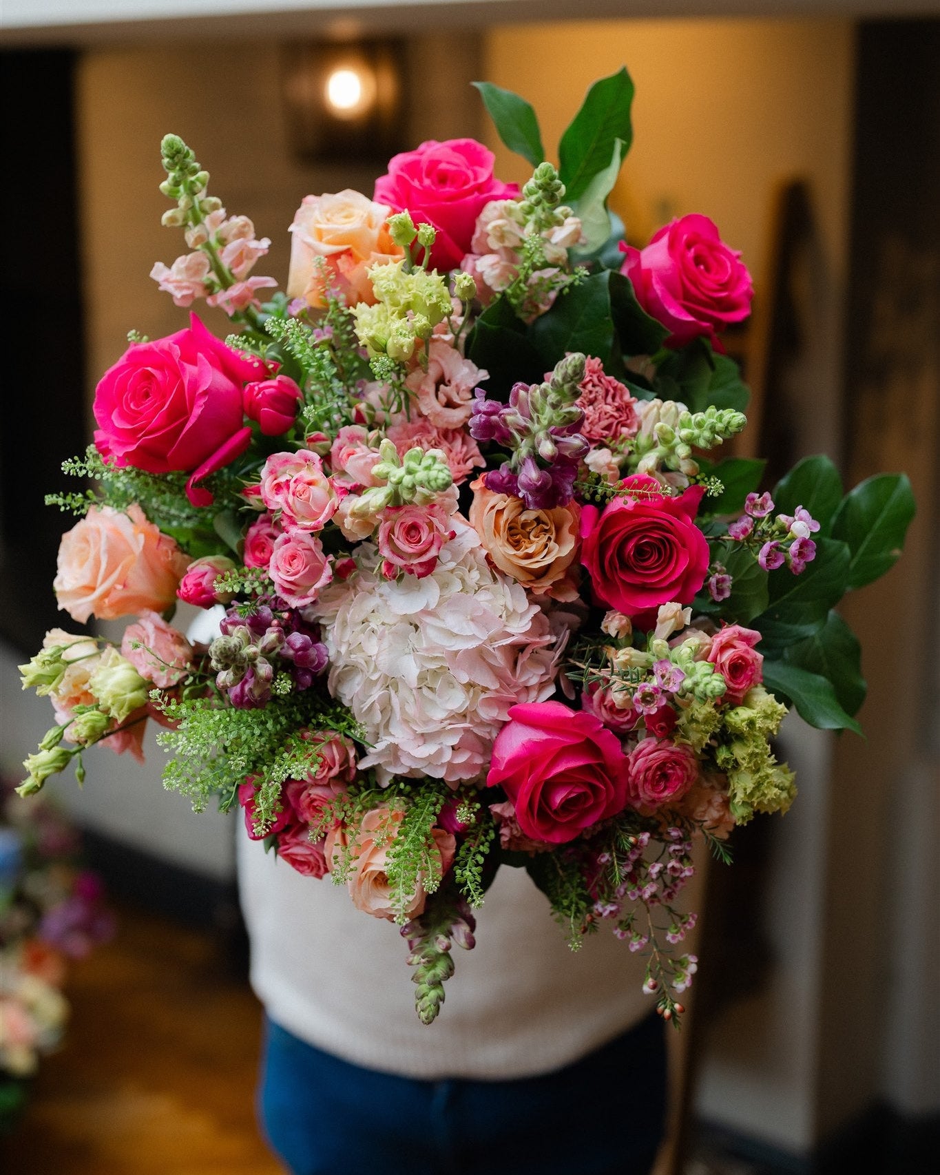 Designed in a generous, abundant style, this luxury Motherâs Day bouquet features classic roses, romantic tea roses, cloud-like hydrangeas, elegant snapdragons, delicate thlaspi, lisianthus (Lizzy) and soft waxflower. Itâs full, expressive and unapologetically beautiful â the kind of bouquet that takes centre stage the moment it arrives.