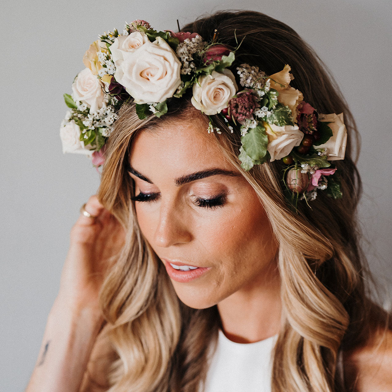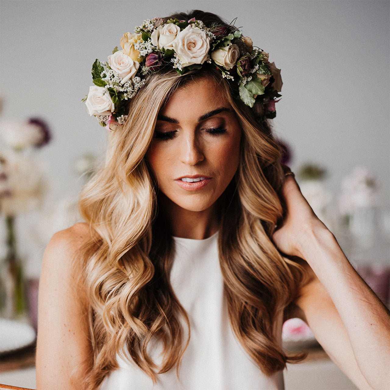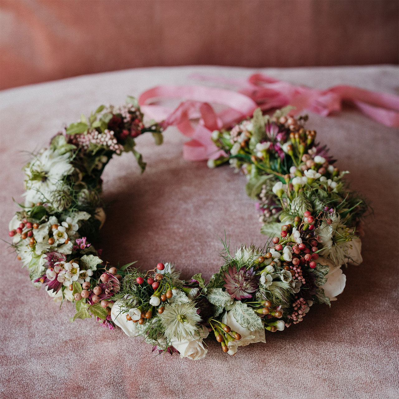 A romantic flower crown created with dainty flowers and seasonal greenery all wired together to create a circlet of flowers which is finished off with ribbon ties, so the size is adjustable to suit.