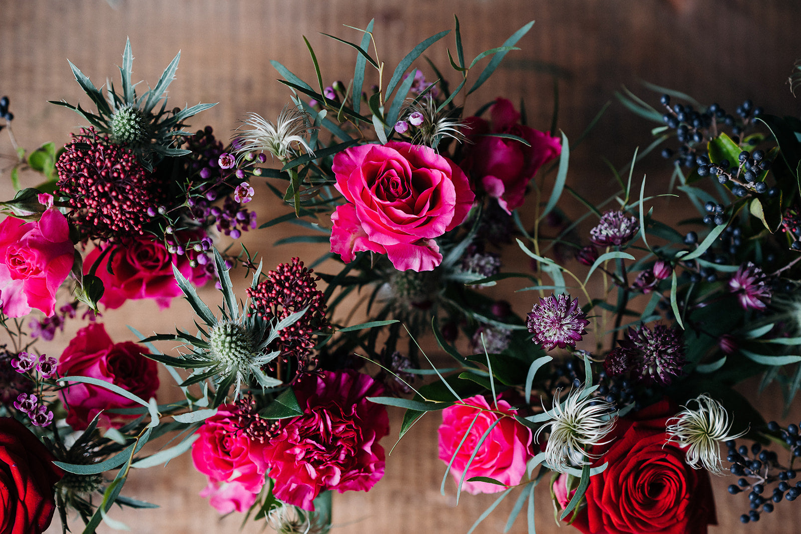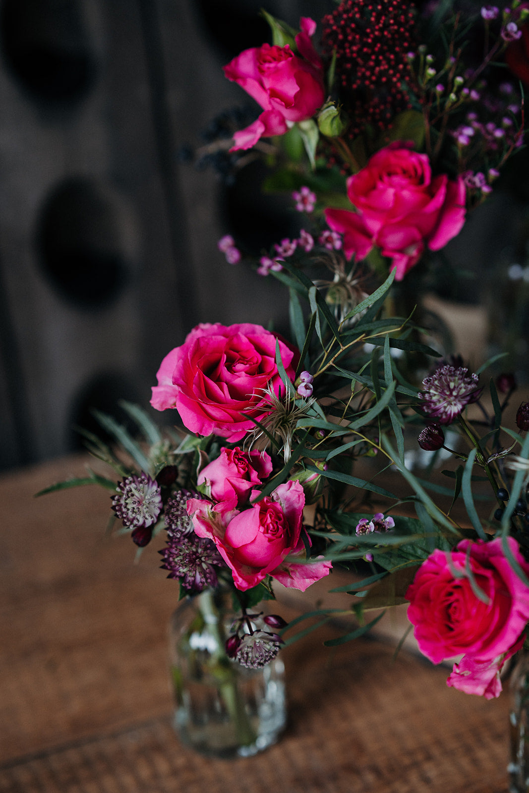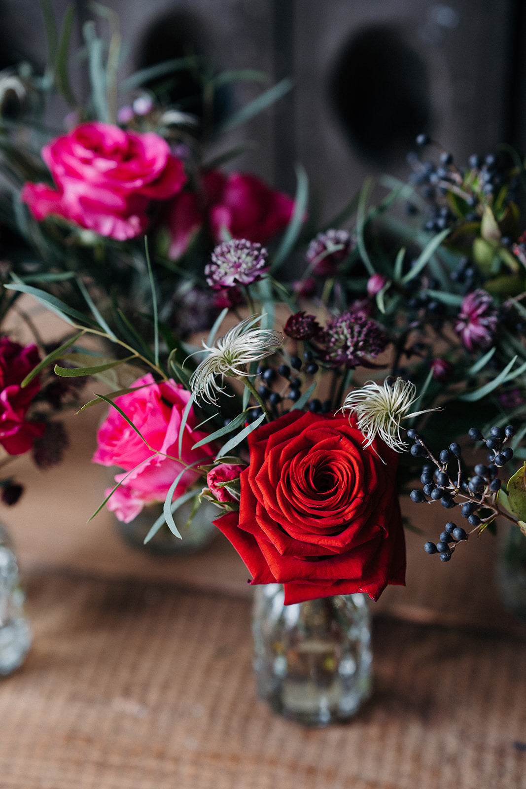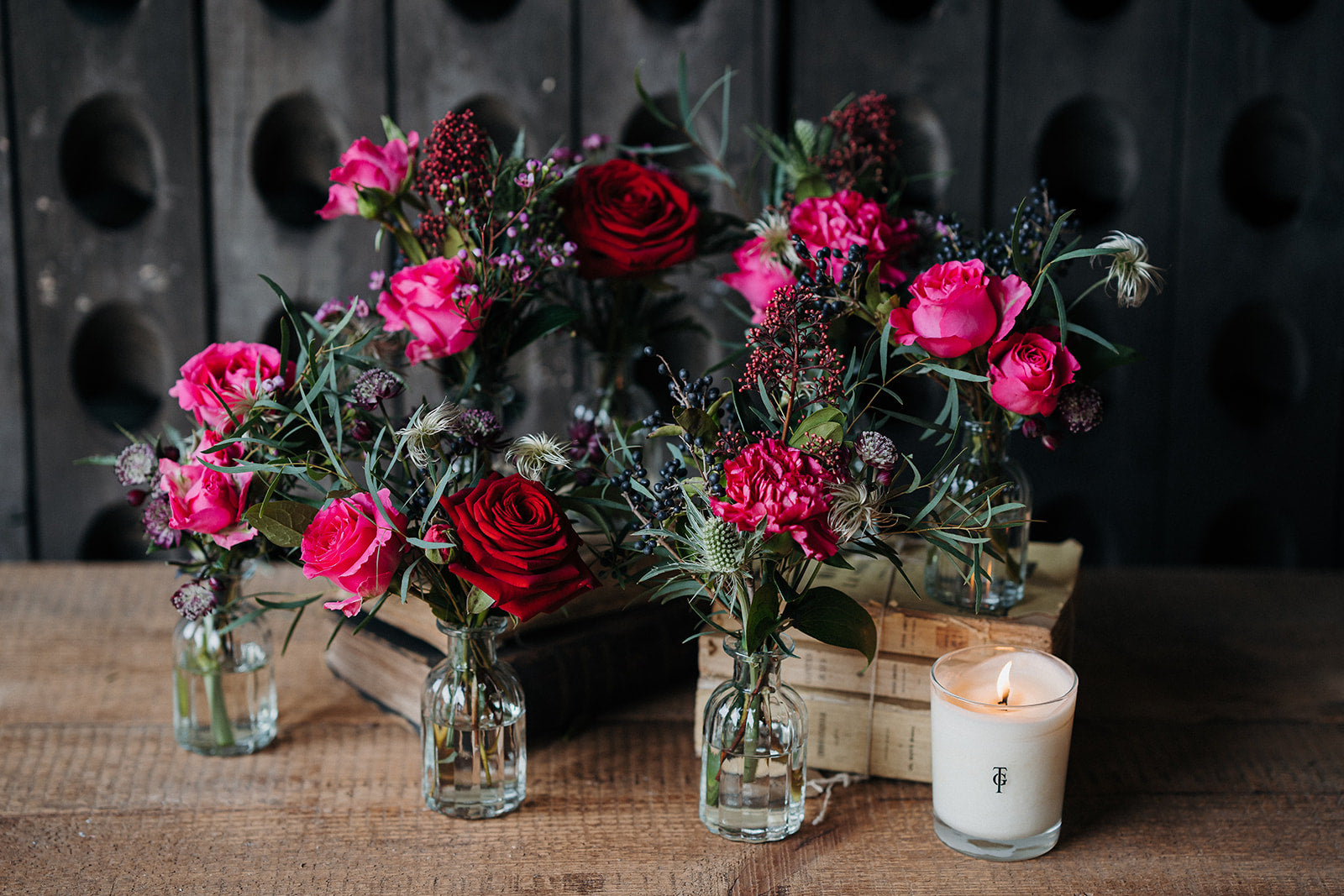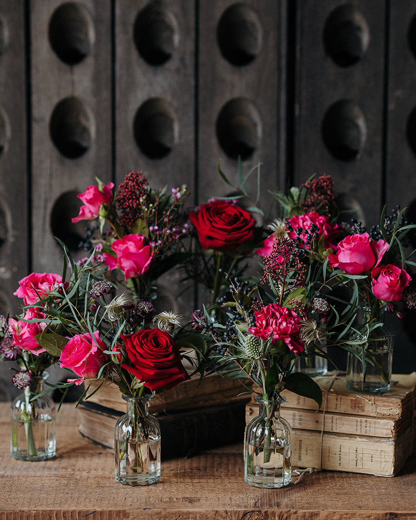 Expect a rich and romantic palette of red and hot pink roses, dianthus, berries, sea holly, skimmia, and astrantia, all nestled amongst scented seasonal foliage. Each bud vase is artfully arranged to complement each other, creating a stylish, effortless display — perfect for a dining table, mantelpiece, or bedside table.