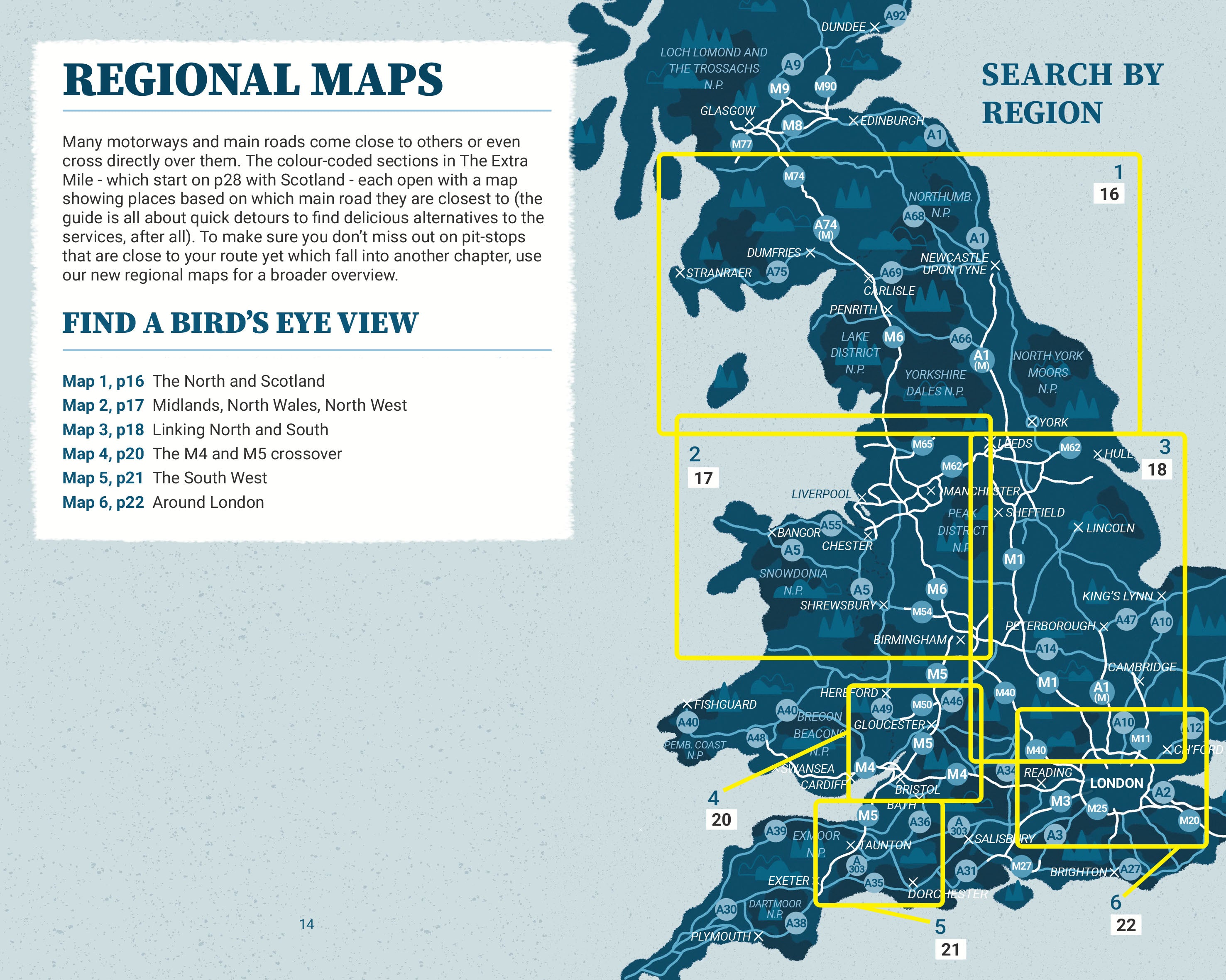 The Extra Mile Guide is your glovebox companion for escaping the monotony of motorway services. Packed with around 300 hand-picked pit-stops across England, Scotland and Wales, it helps hungry travellers find fresh, local and original food while supporting the independent businesses behind Britain’s growing local food revolution.