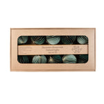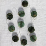 Presented in a recycled cardboard gift box, this Emerald & Mint coloured garland is laced with LED lights (with timer) that make the golden edges of these boule shaped pleated decorations come alive with celebratory spirit. A perfect gift to brighten somebody’s day. Battery powered (3xAA, not supplied). Made from recycled card and paper.