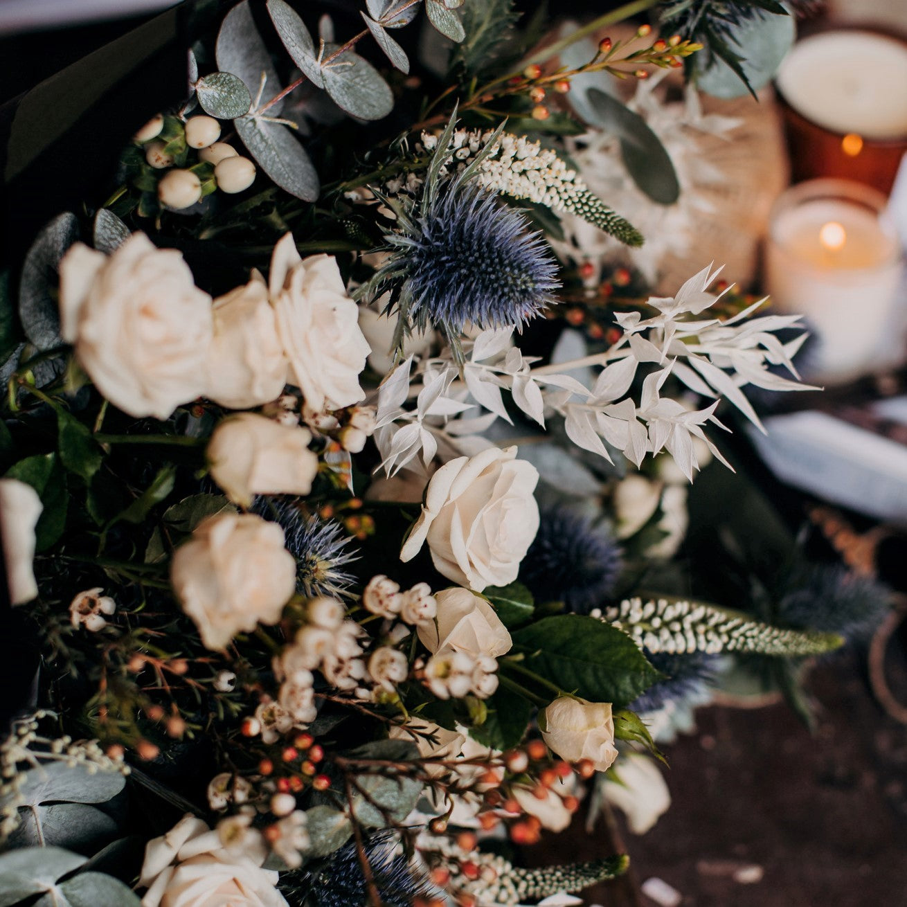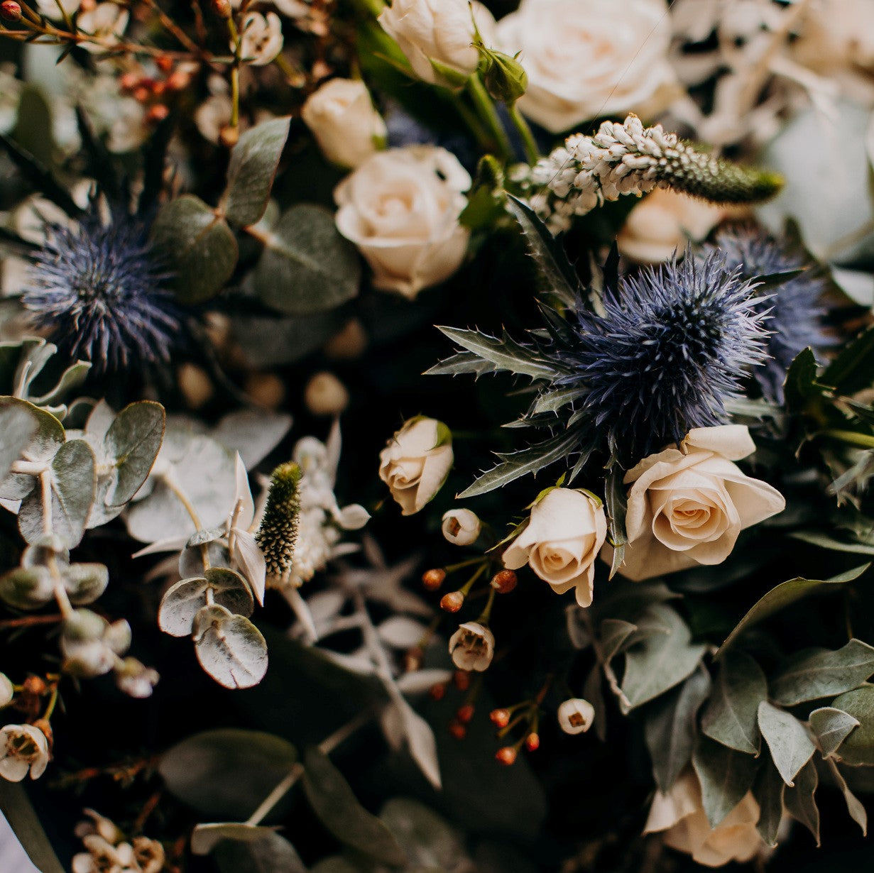 Our Isle of Skye Bouquet captures the untamed charm of the Celtic Highlands — a hand-tied design that balances rugged texture with delicate romance. Inspired by the windswept Isle of Skye, this bouquet features striking blue thistle, soft white waxflower, elegant veronica, and the warm tones of hypericum berries, celebrating nature’s wild beauty at its finest.