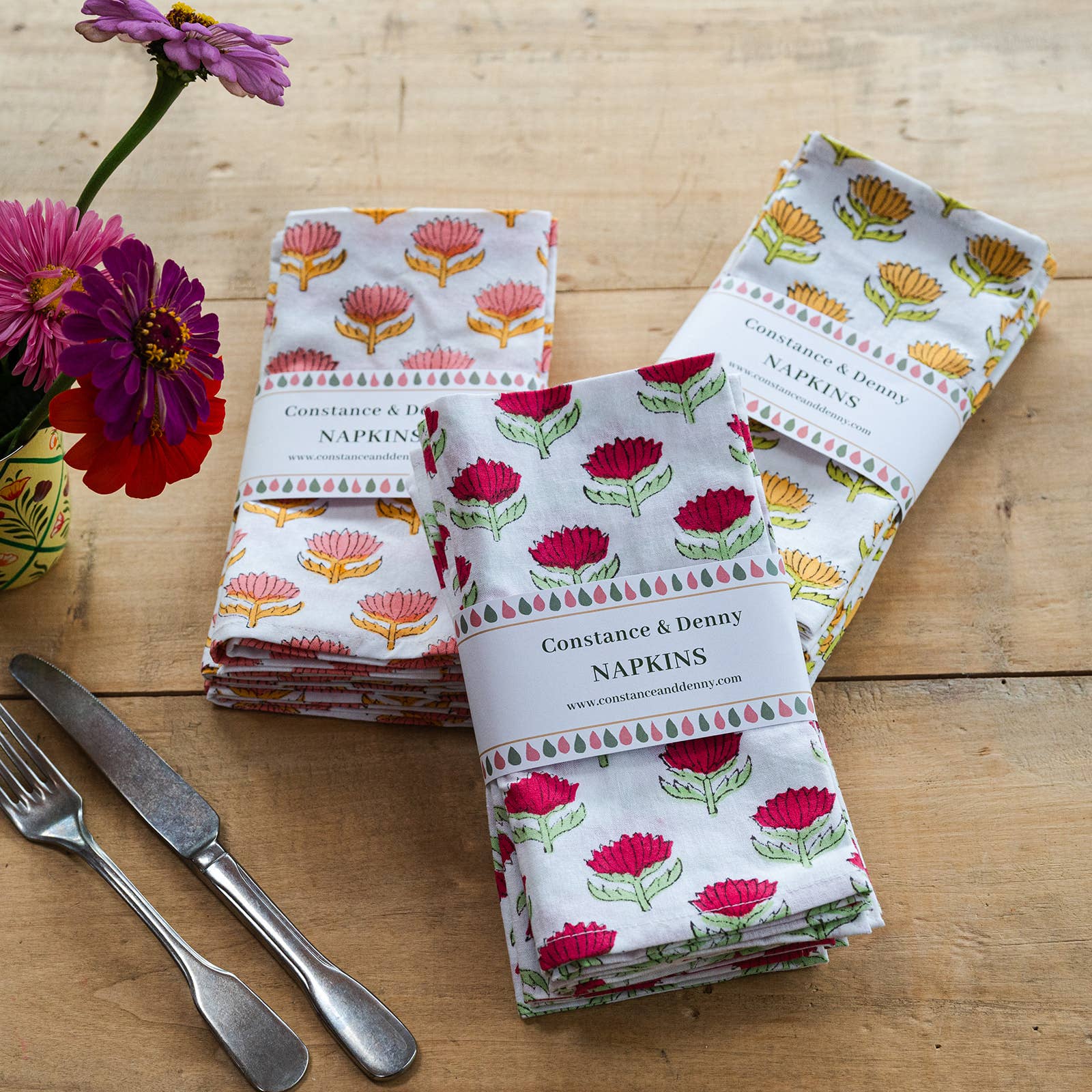 The Lotus Flower Napkins feature a timeless Indian motif, beautifully reimagined in a fresh, modern colourway. Hand block-printed in small batches on premium cotton, each napkin showcases intricate craftsmanship and soft, uplifting tones that elevate any table setting. Designed to pair perfectly with our In Bloom tablecloth or NEW Floral Garland tablecloth, they add a refined touch to everyday dining or special occasions. Available in four colours—Cherry Pink, Lilac, Sage & Pink, and this newly recoloured version—these napkins come as a set of six, each measuring 45 x 45 cm. Gentle to care for and ethically produced by family-run partners, they bring artistry, tradition, and thoughtful design to your home.