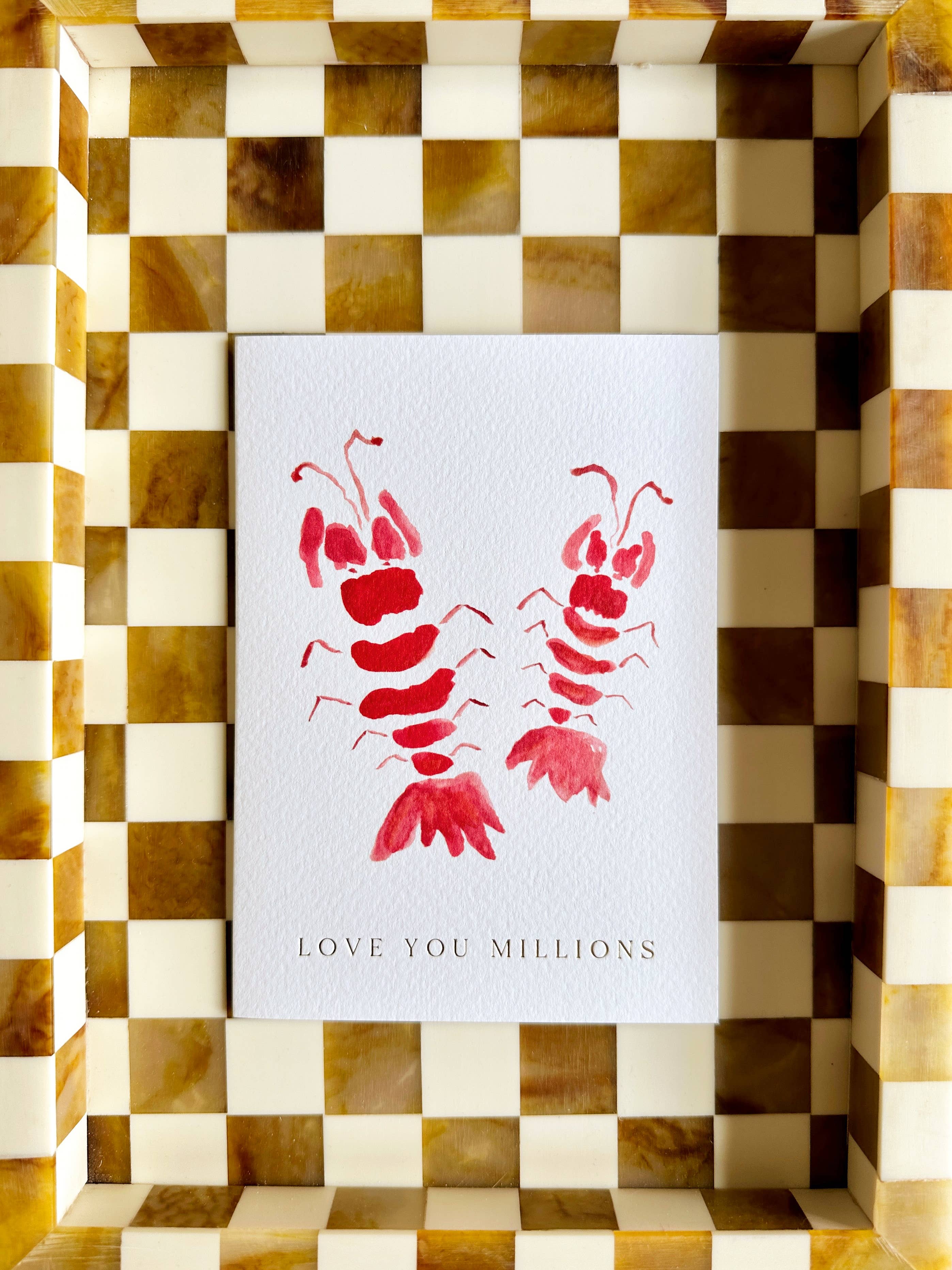 Show them how much you care with this hand-painted lobster love card, featuring two watercolour lobsters and the sweet subtext “Love You Millions” in traditionally embossed gold foil. Thoughtful, playful, and full of heart, it’s a modern way to say “I love you” without reaching for the obvious.