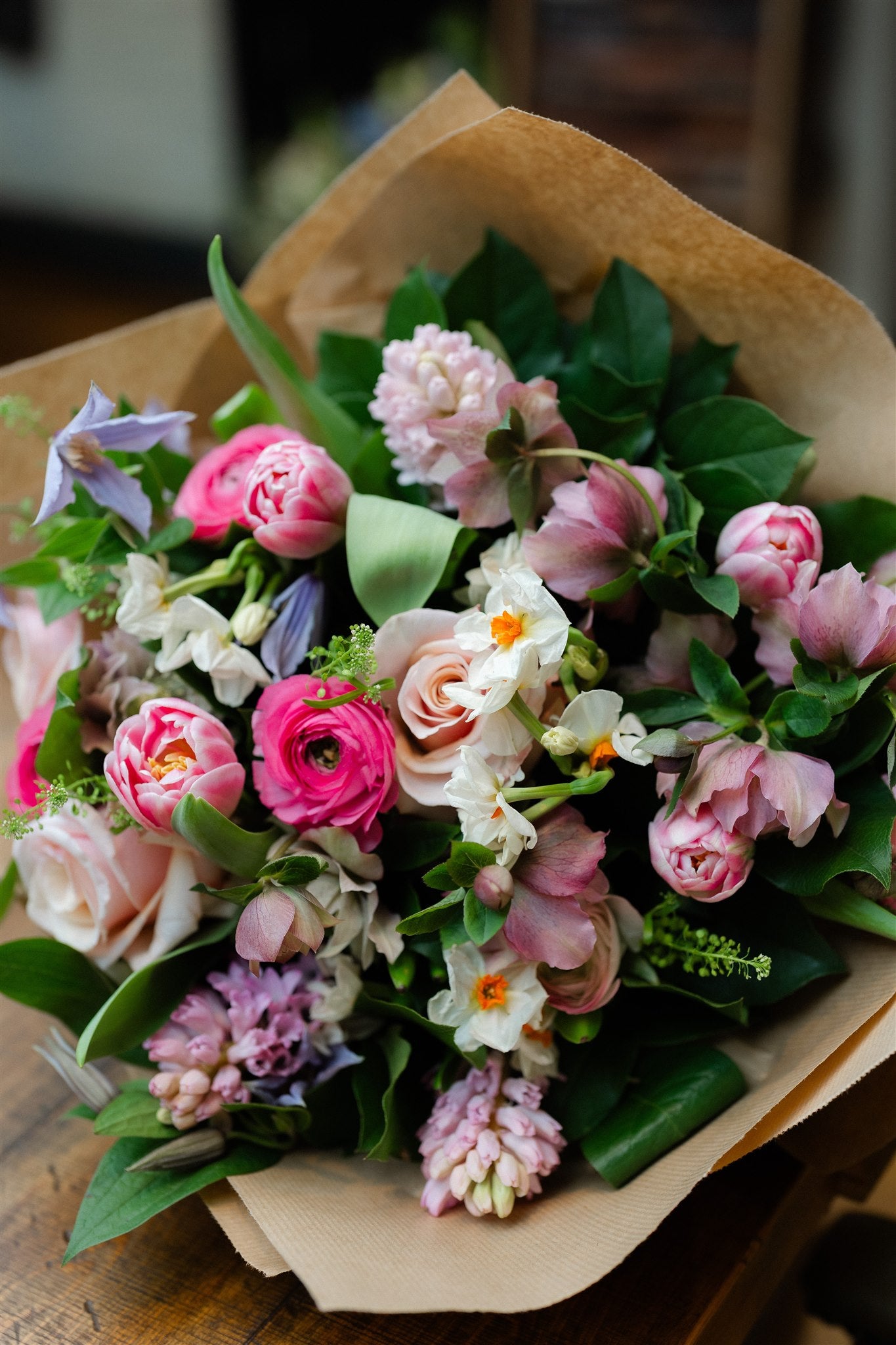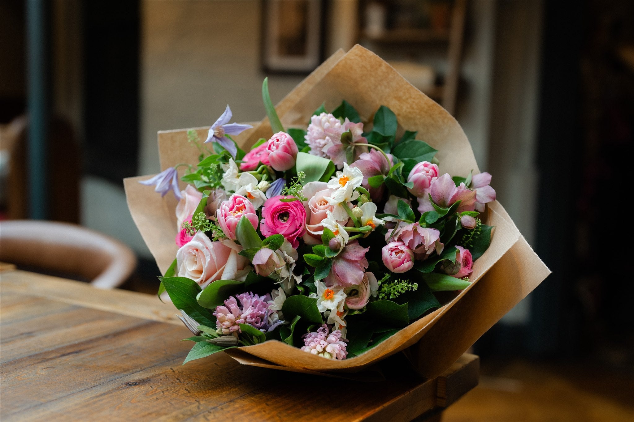 This hand-tied spring bouquet features romantic ranunculus, Mother of Pearl roses, scented pink hyacinth, elegant double tulips, hellebores and delicate narcissus. A palette of pink, apricot, buttermilk and lilac creates a refined yet uplifting arrangement that feels completely at home in early spring.