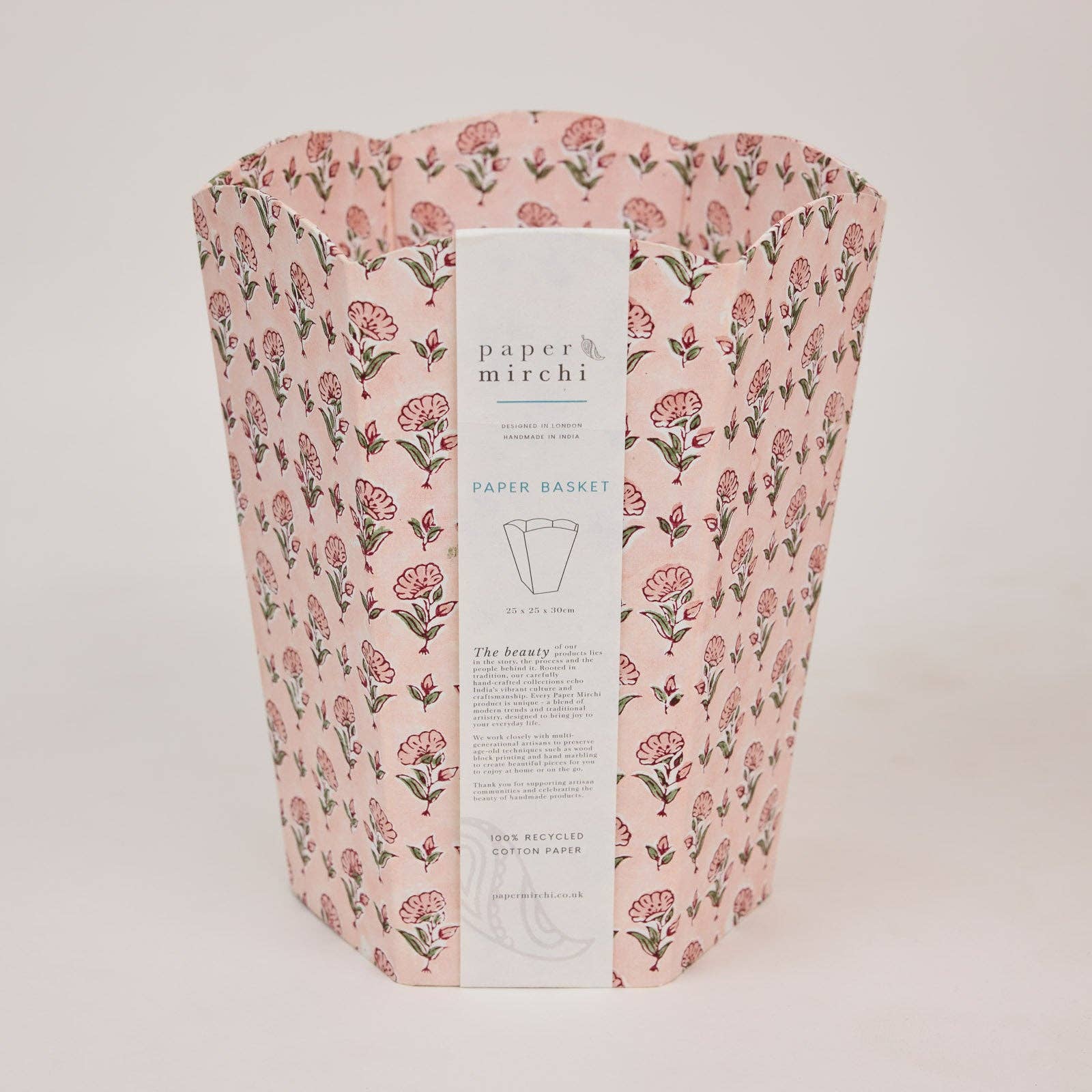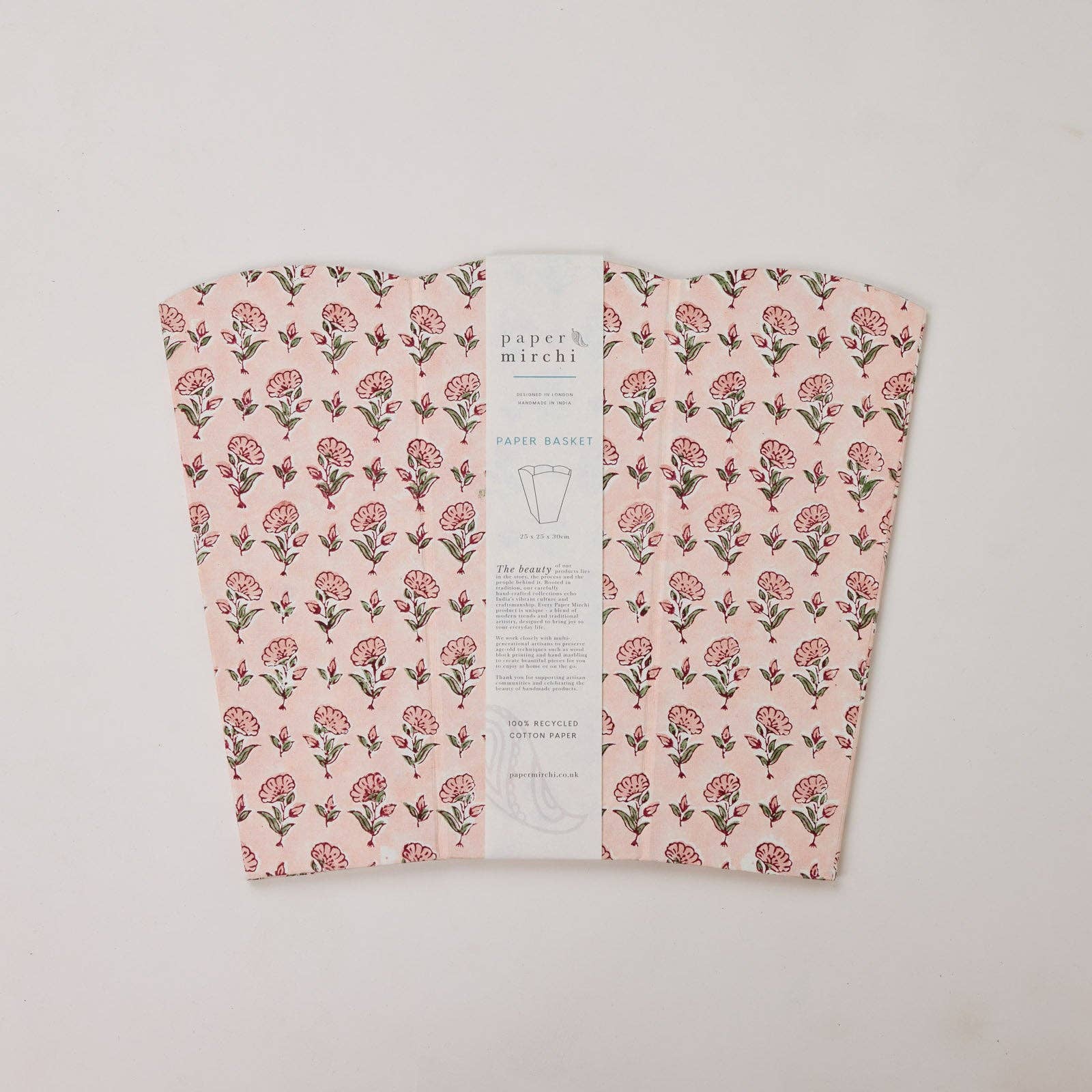 Each basket is artisan-crafted using 100% recycled cotton rag paper, brought to life through traditional block printing techniques passed down through generations. Finished with Paper Mirchi’s signature block print designs, every piece is a small celebration of craftsmanship, care, and considered living.