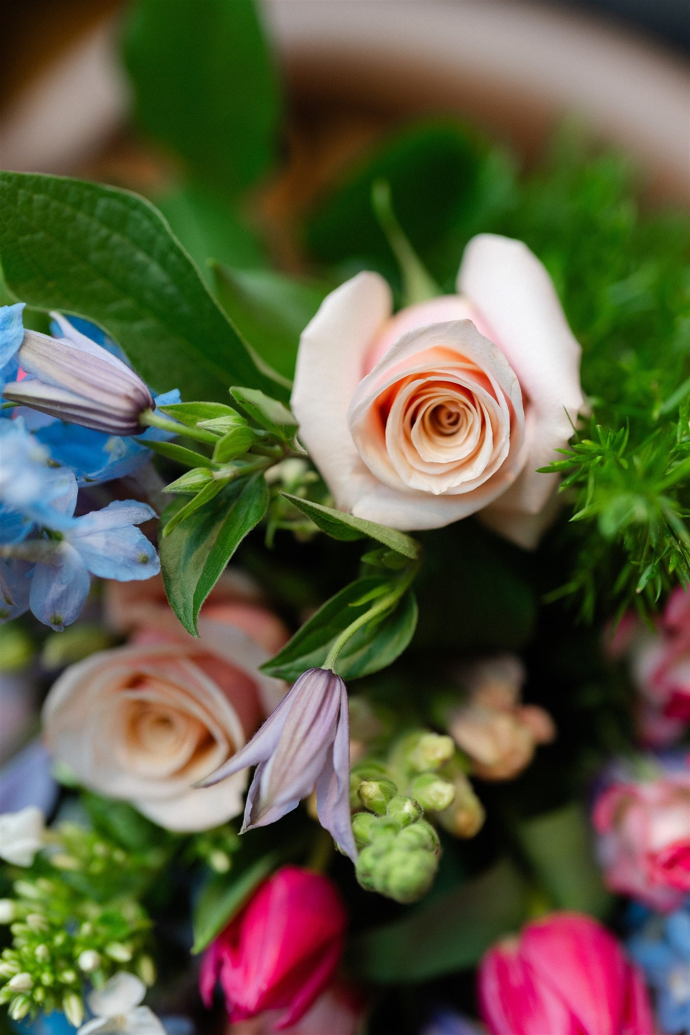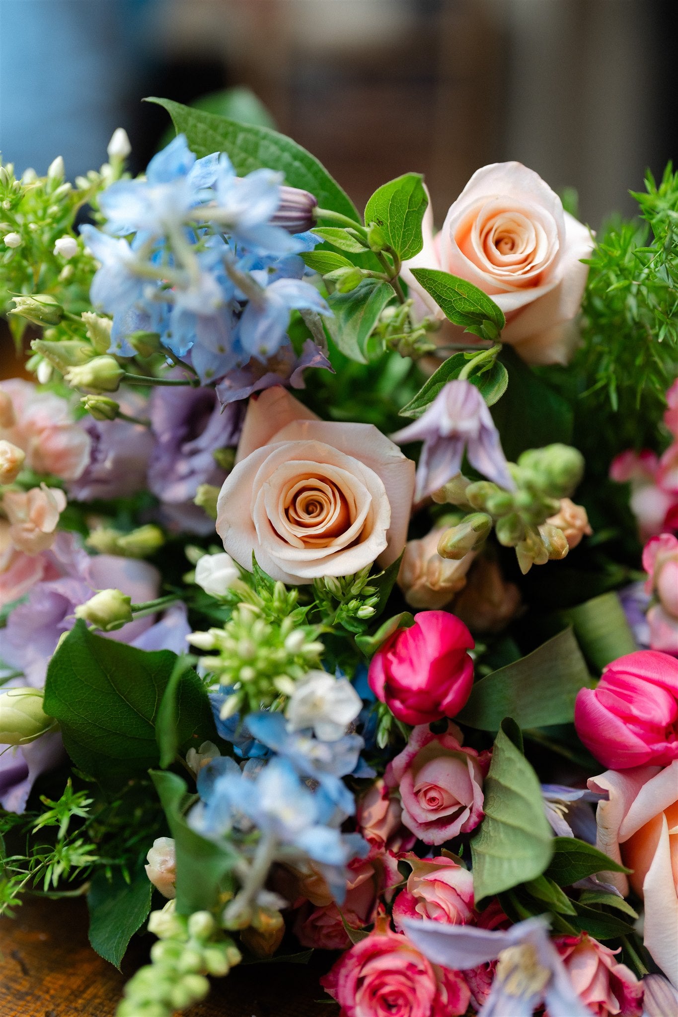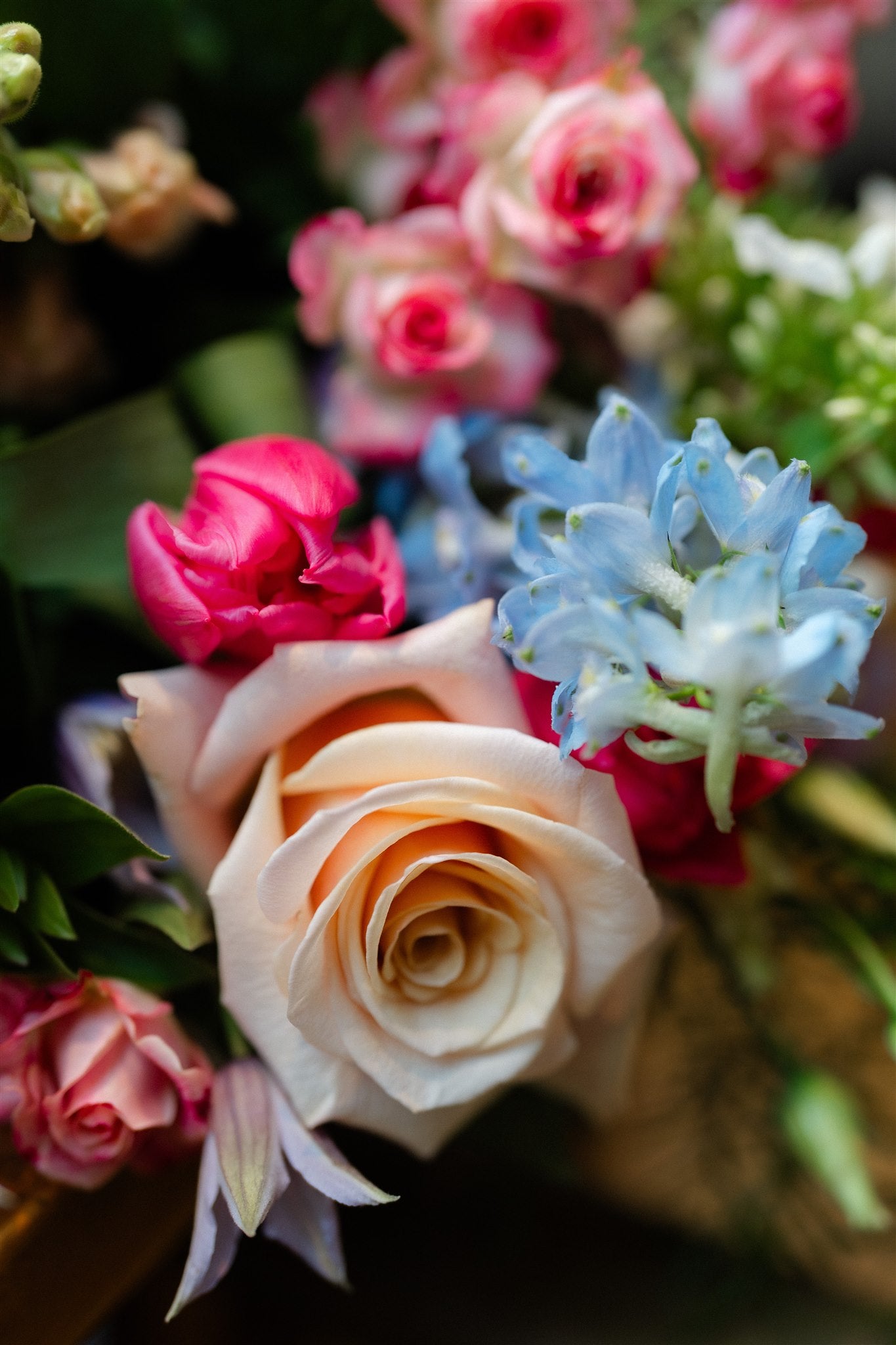 Created in striking hot pink and soft powder blue tones, this hand-tied Mother’s Day arrangement features luminous Mother of Pearl roses, Flinders Lane tea roses, bold hot pink tulips, elegant pink snapdragons and airy powder blue delphinium. Zesty viburnum pom poms add freshness and texture, creating a bouquet that feels joyful, expressive and unapologetically confident.