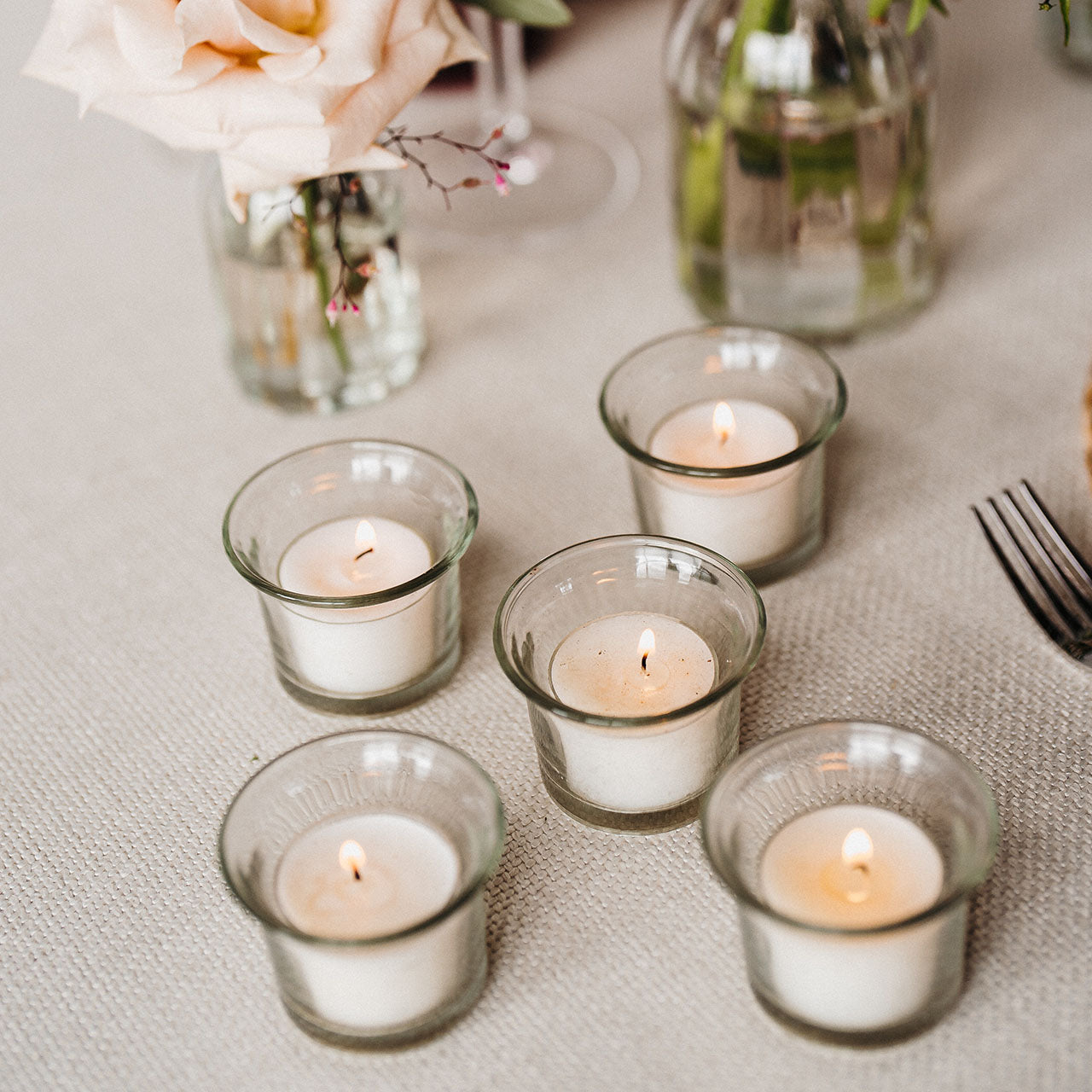 When looking to create a romantic tablescape atmosphere, tealights are the perfect answer – they come in clear glass votives with an 8 hour burn tea light. Perfect to mix and match with our taper candles to create flickering candlelight at different heights.