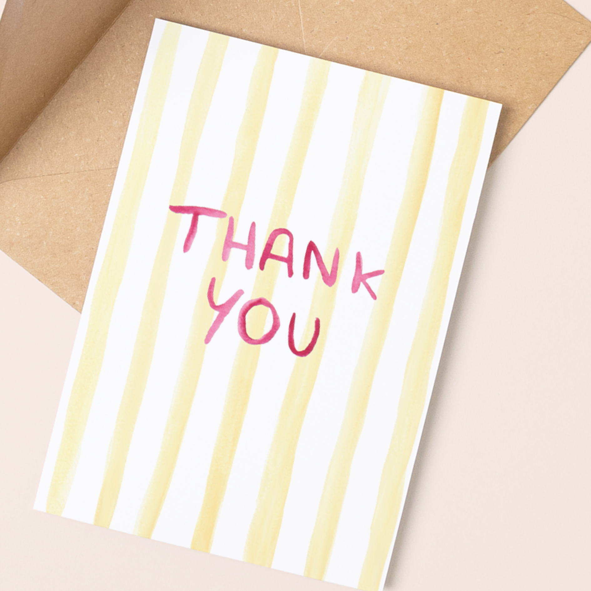 Say thank you in style with this hand-painted thank you card, featuring cheerful yellow stripes and a bold raspberry-red Thank You design. Bright, joyful, and full of personality, it’s guaranteed to bring a smile to anyone lucky enough to receive it.