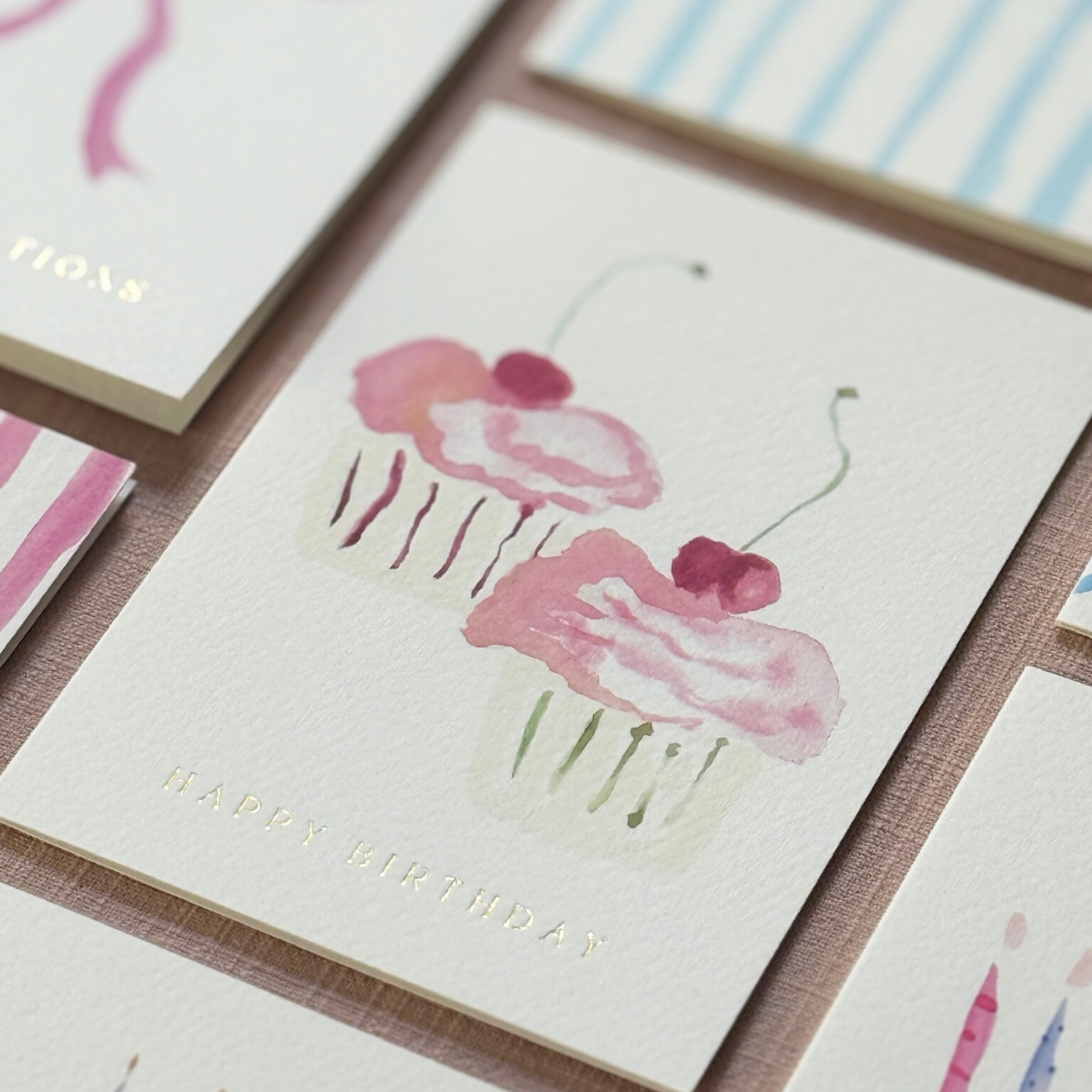Celebrate their birthday with this hand-painted cupcake birthday card, featuring beautifully illustrated cupcakes piled high with thick frosting and cherries on top. Finished with a traditionally embossed gold foil “Happy Birthday”, it adds just the right touch of shine and luxury.