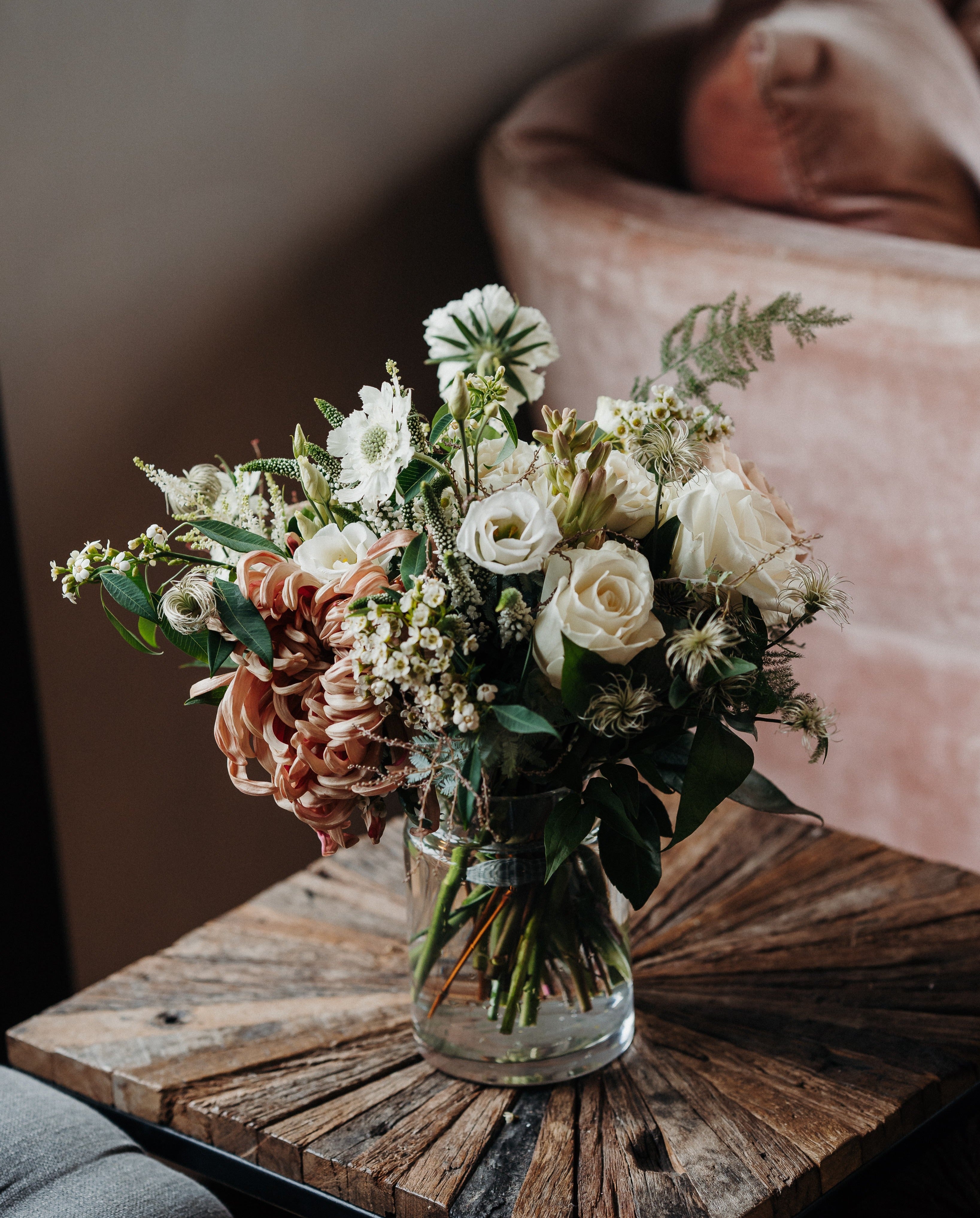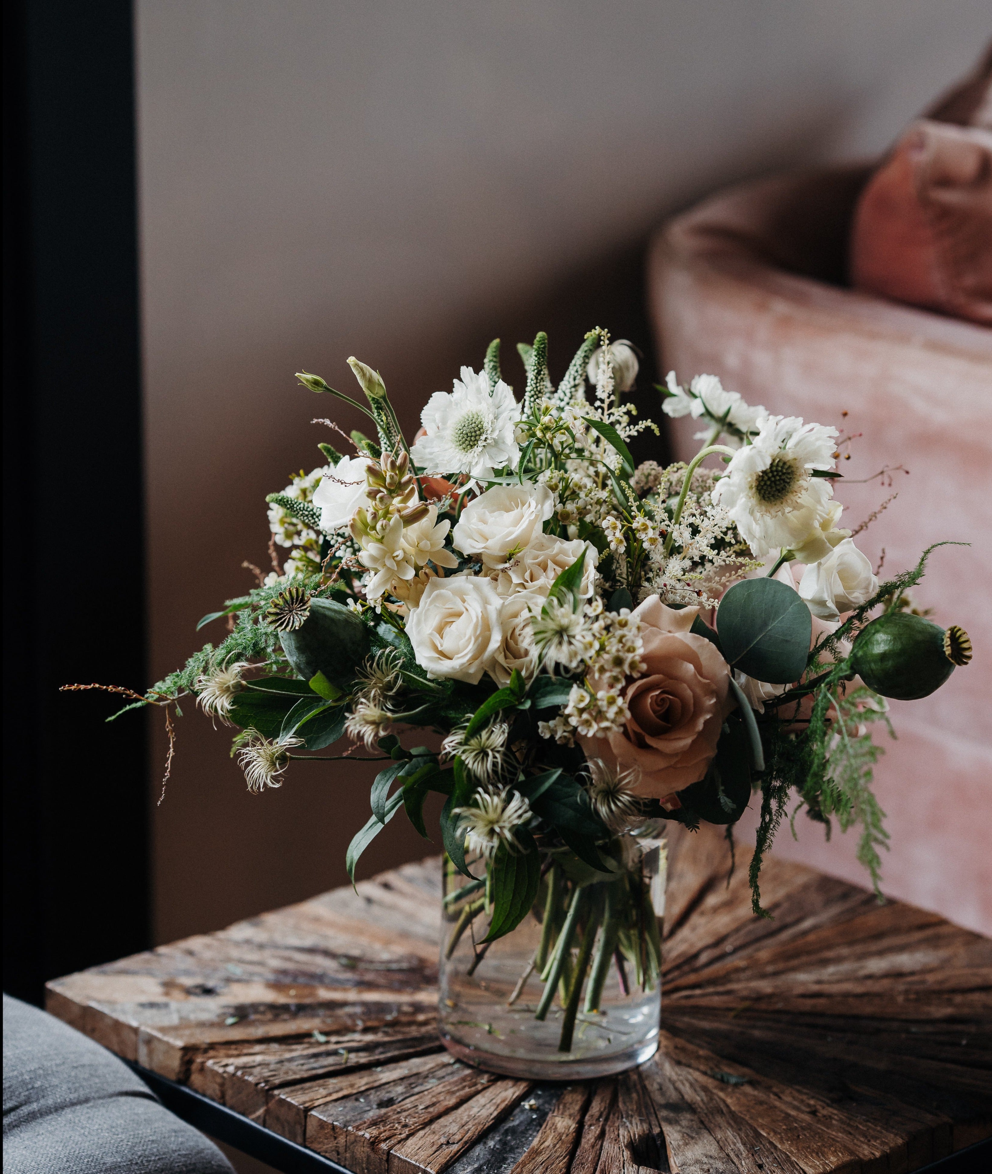 A beautiful floral design in your chosen colour palette displayed in a posy vase ideal for side tables, long guest tables. (Perfect for long tables clustered with bud vases to create a picture-perfect tablescape).