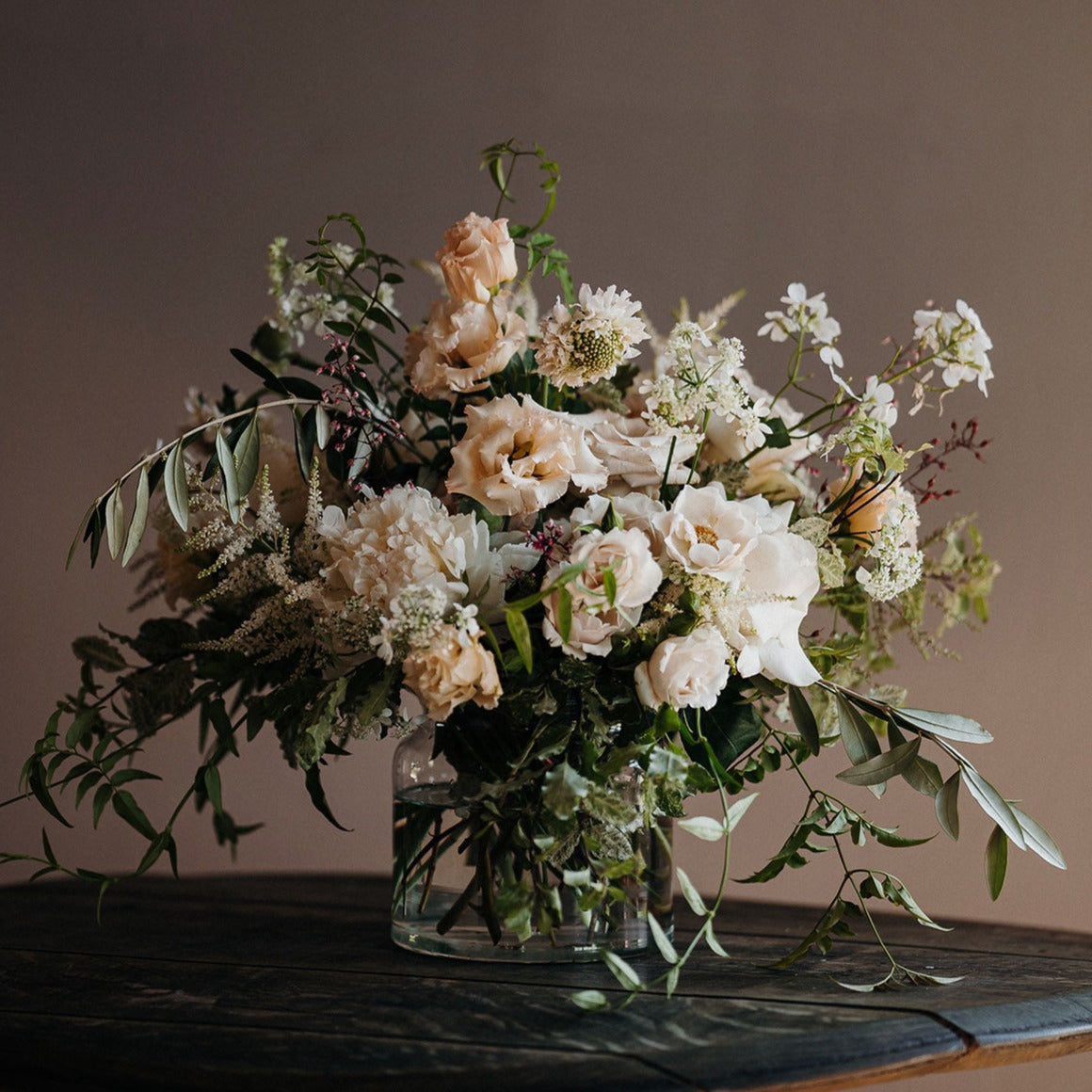 A WOW floral design with tumbling flowers in your chosen colour palette designed to be the perfect height in a vase to be used as a table centrepiece that has the ultimate WOW factor, yet still allowing guests to talk across the table. (Perfect as a centrepiece for a round table seating 8-12 people)