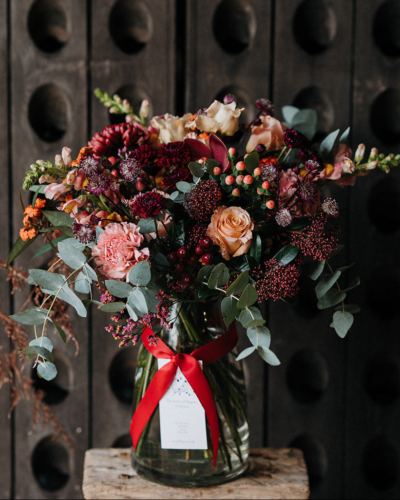 Each arrangement is bespoke, brimming with texture and tone — think seasonal berries, fragrant eucalyptus, and subtle hints of shimmer to catch the candlelight. Standing approximately 50–60 cm tall in a 28 cm vase, it’s perfectly sized to make an impression without stealing the whole show.