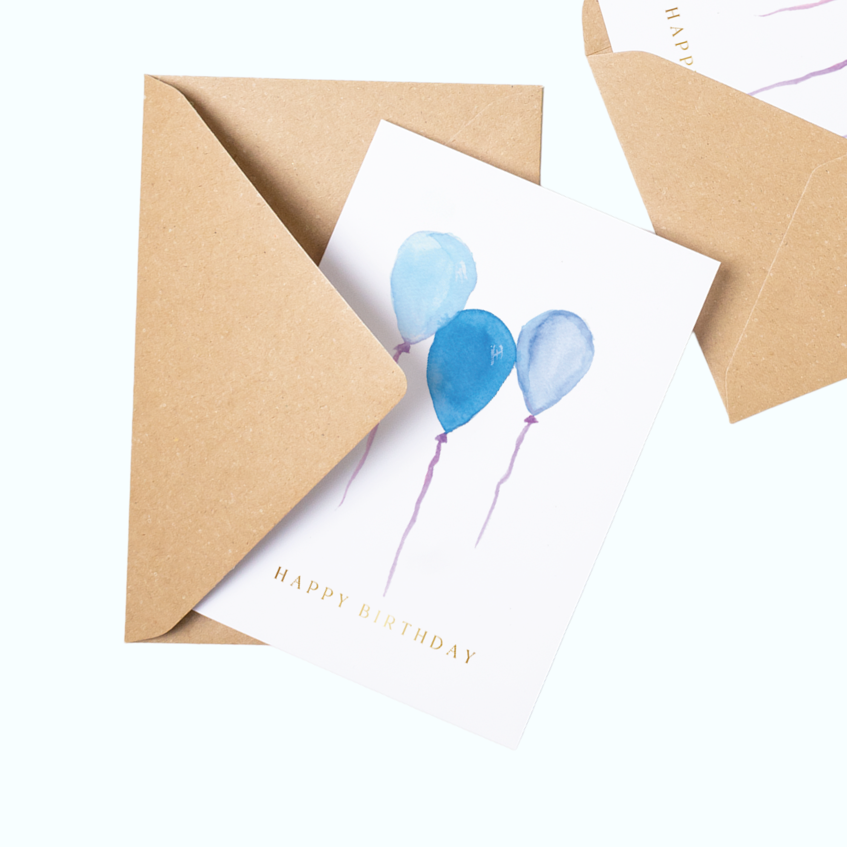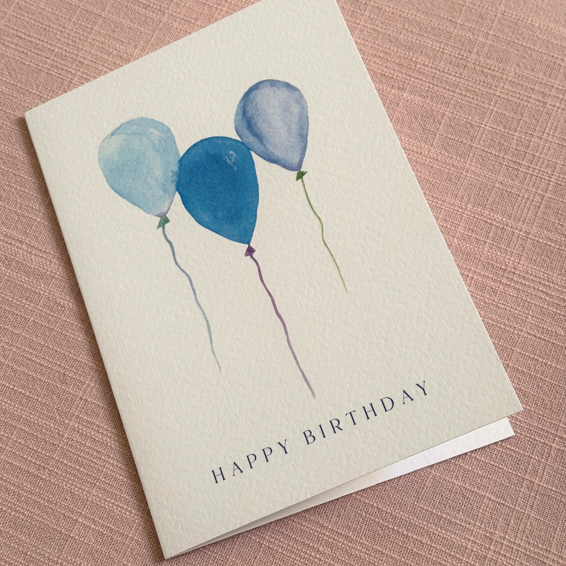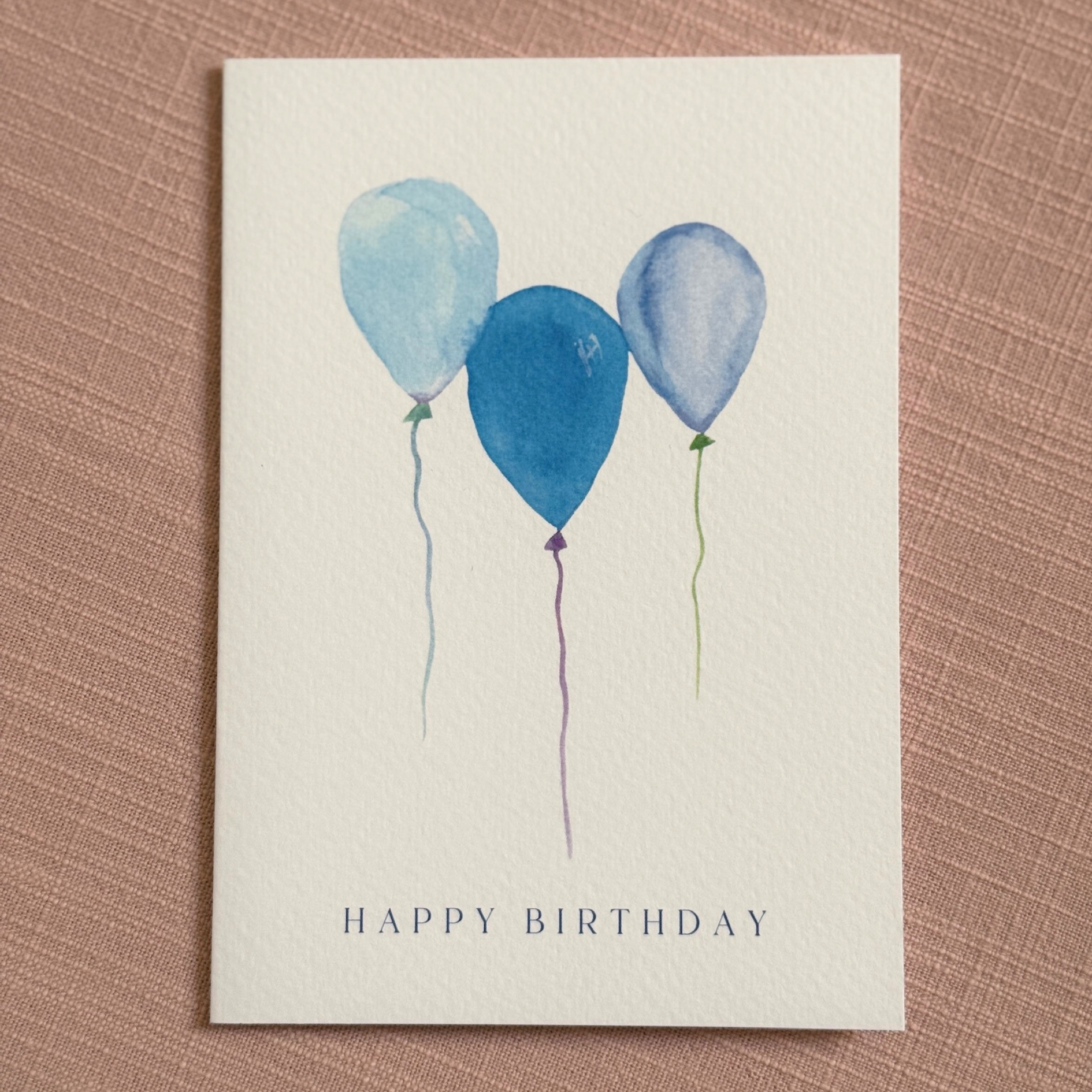 Celebrate their birthday with this hand-painted watercolour balloon birthday card, featuring soft blue balloons and a light, uplifting design. Perfect for birthdays of all ages, this cheerful card is guaranteed to brighten their day — because balloons make everything better.