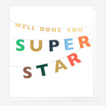 This cute colourful bunting 'well done you super star' congratulations card features gold foil and embossing for that extra special touch.
