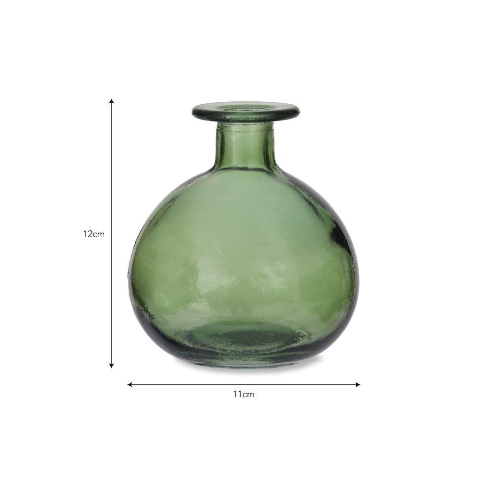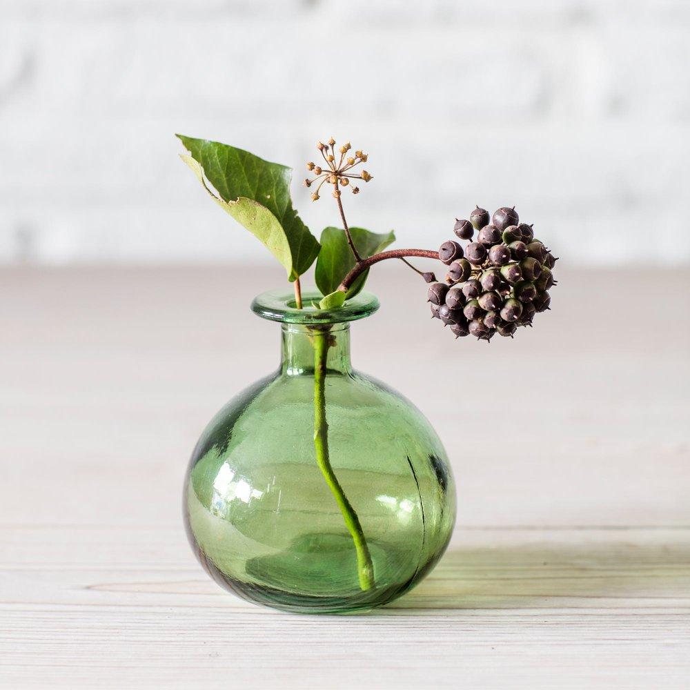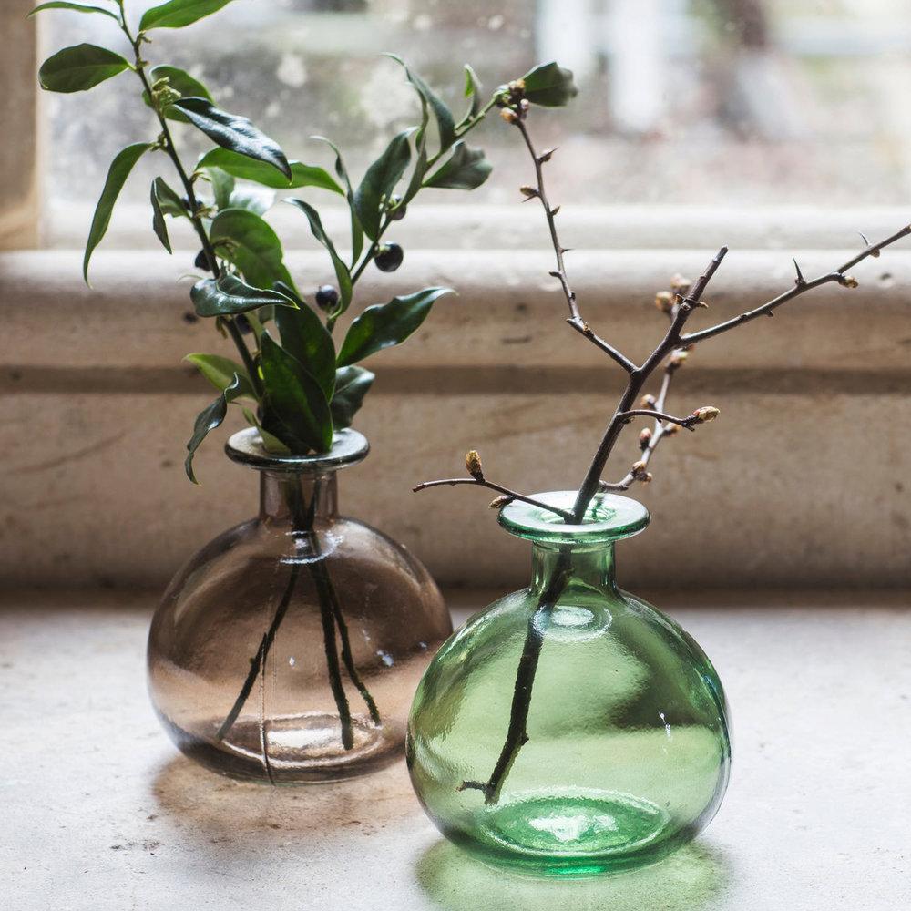 Crafted from 100% recycled glass, the soft yet bright choice of colours works beautifully when teamed with a striking single stem. With its petite globe shape and narrow neck, it's an effortless way to bring a fresh touch indoors in a spot that can't accommodate a large bunch of flowers.